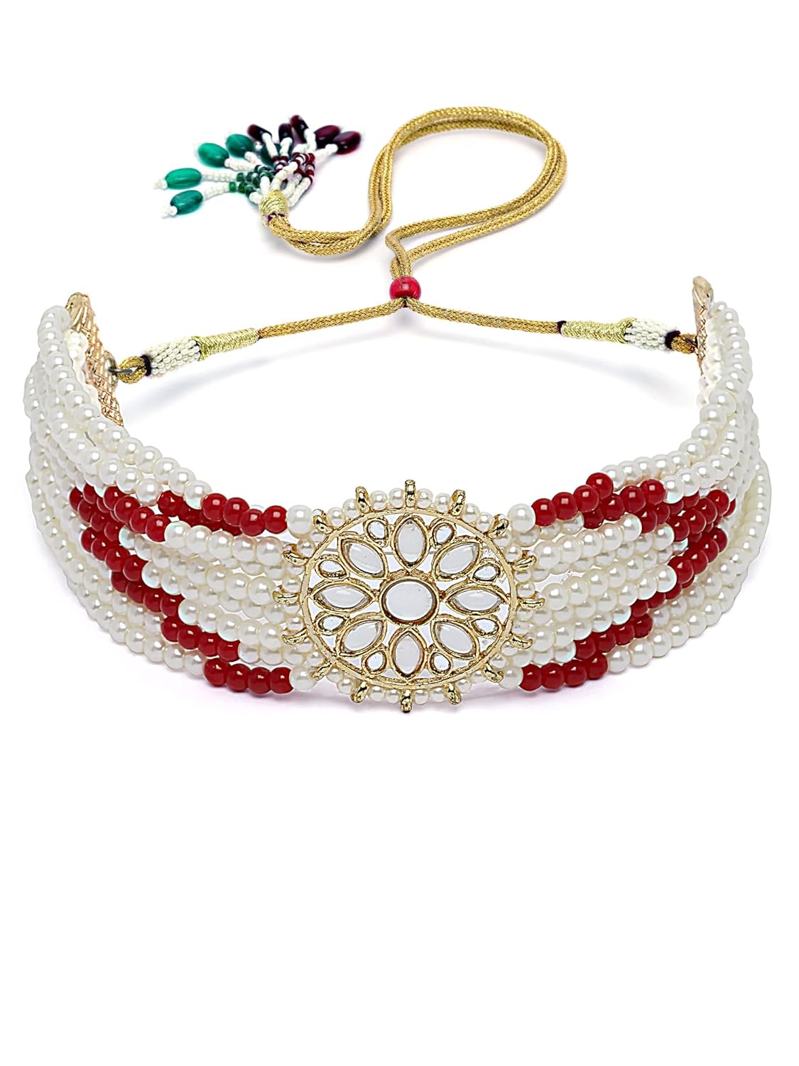 Karatcart Gold Plated White Pearl and Red Beads Kundan Choker Necklace Set for Women