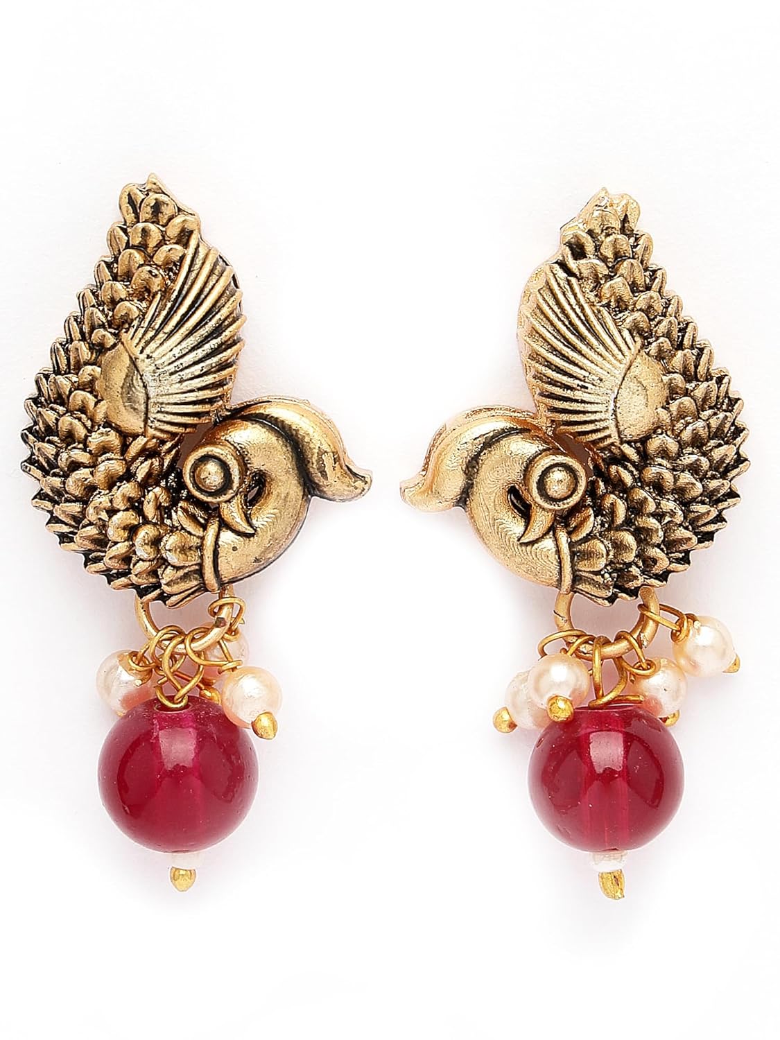 Karatcart Graceful Gold Plated Red Bead Laxmi Mata on Peacock Long Temple Jewellery Set for Women