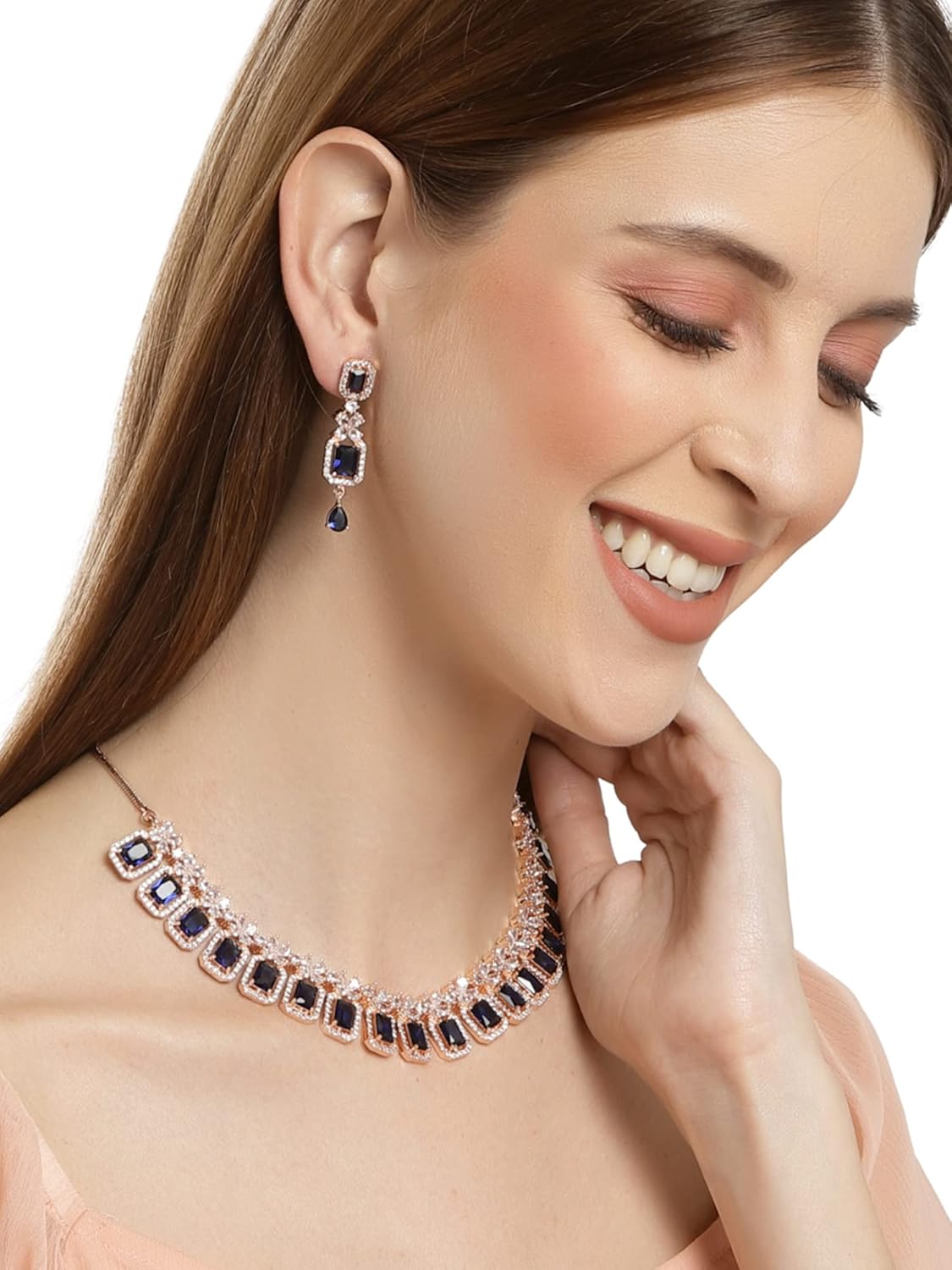 Karatcart Rose Gold Plated Blue American Diamond Necklace Set for Women