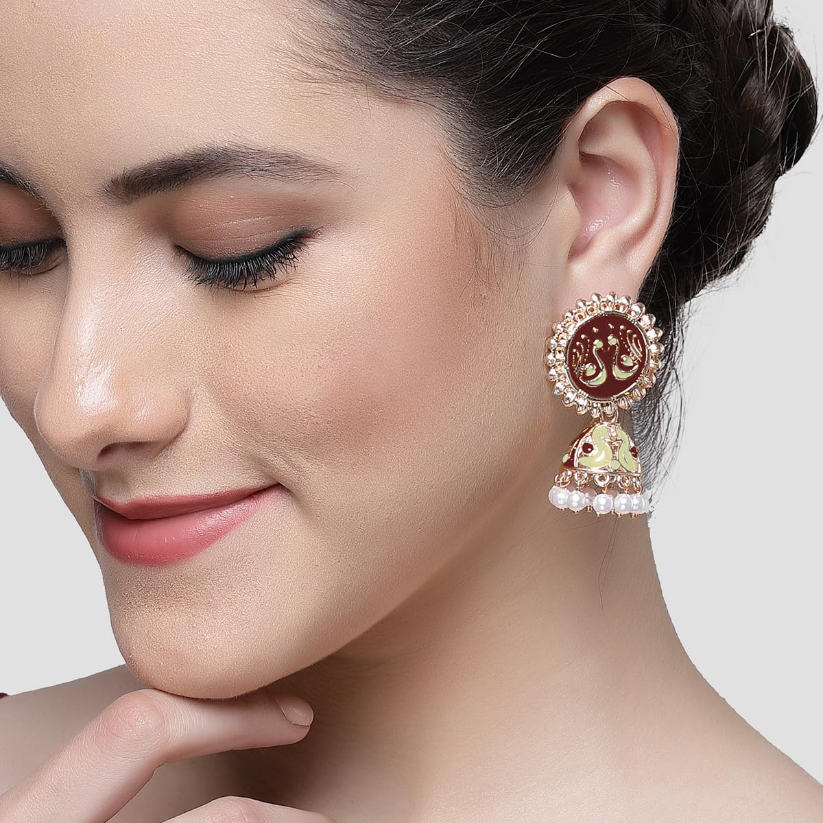 Karatcart Rose Gold Plated Peacock Design Brown and Cream Meena Jhumki Earrings for Women