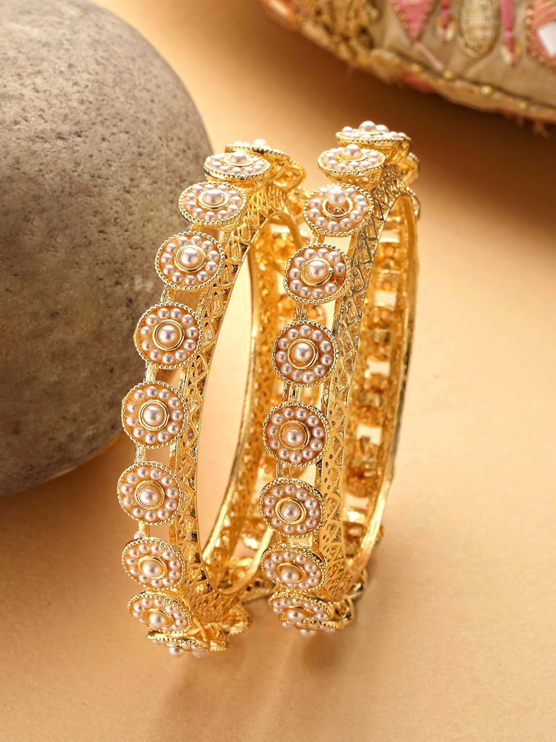 Karatcart Set of 2 White Pearl Studded Gold Plated Bangles for Women