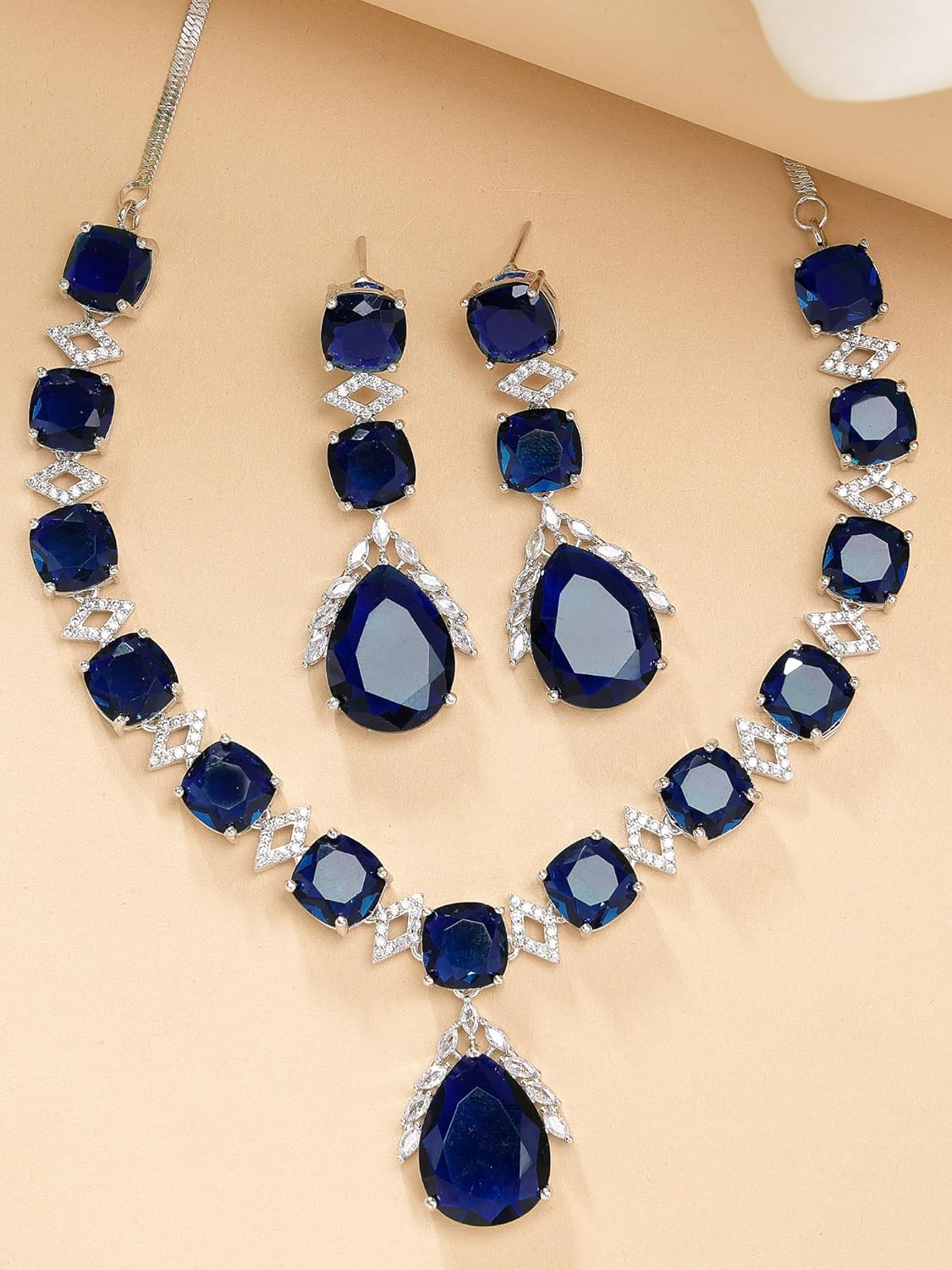 Karatcart Silver Plated Green Drop Shape American Diamond Studded Necklace Set for Women