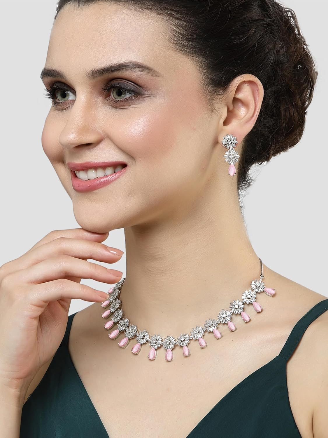 Karatcart Silver Tone Floral Design Green American Diamond Studded Necklace Set