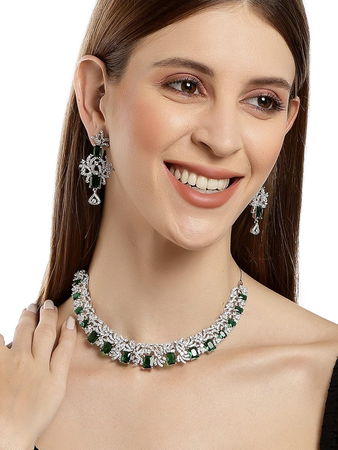 Karatcart Silver Tone Green American Diamond Necklace Set for Women