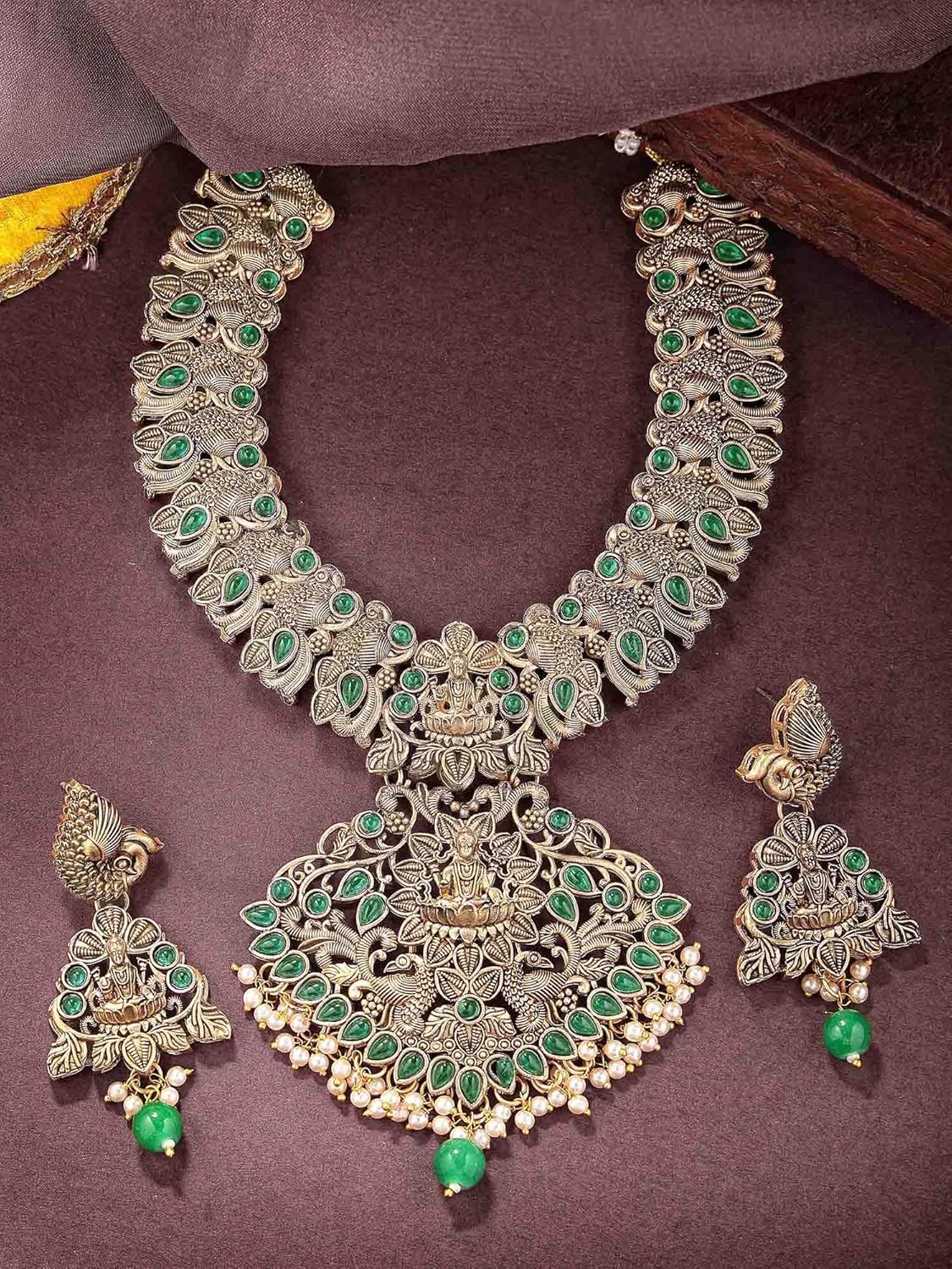 Karatcart Traditional Gold Plated Green Stone Laxmi Mata Temple Jewellery Set for Women