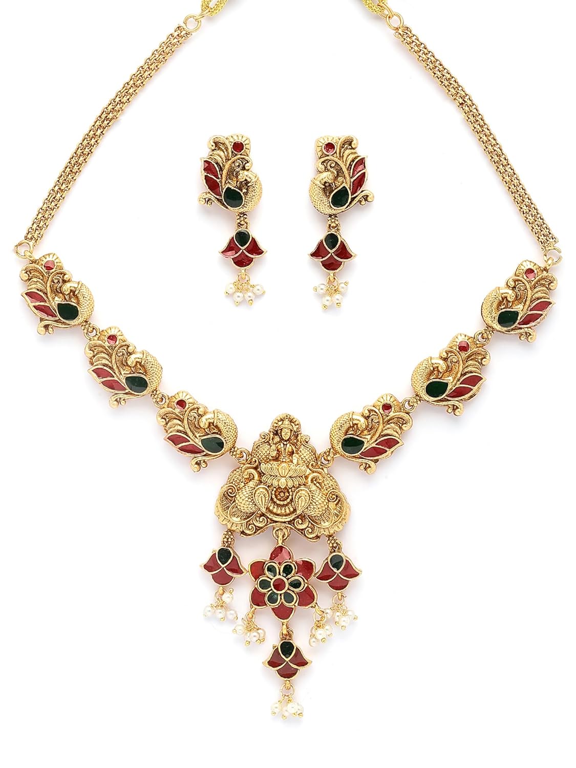 Adorn yourself in divine elegance! This Karatcart Traditional Laxmi Mata Temple Jewellery Set, featuring vibrant red and green Meenakari work on gold plating, is essential for every traditional occasion. Elevate your ethnic attire with this classic, sacred design. Feel the luxury and tradition. Buy this stunning set now and be the epitome of grace!