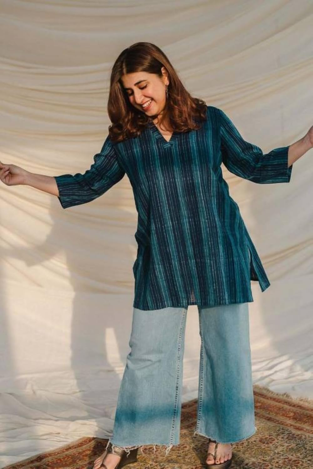 This is light weight material Kurti and it will be soft on your skin.Kurta Fabric: RayStyle: Straight Length: Calf Length || Sleeves: 3/4 Sleeves Size Chart- Kurta-S-36 in, M-38 in , L-40 in , XL-42 in , XXL-44 in,Kurta Color :- TEAL BLUE