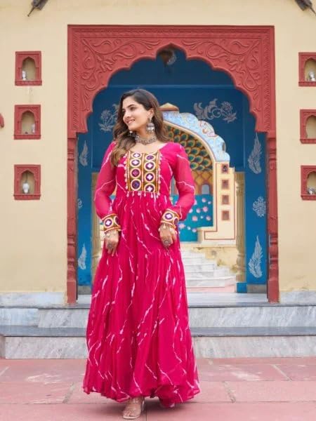 Elevate your festive wardrobe with this stunning Laheriya Georgette Anarkali gown set. The emerald green ensemble features exquisite Kutchi mirror patchwork and traditional Laheriya print, creating a perfect blend of contemporary style and ethnic charm. This three-piece set includes a flowing calf-length Anarkali kurta, complemented by matching bottoms and a graceful dupatta. The regular-fit gown showcases intricate lace embellishments and long sleeves, making it an ideal choice for special occasions like anniversaries and festivals. Crafted from premium Georgette fabric weighing 450 grams, this KD creation ensures comfort and elegance. The floral pattern and printed design elements add sophistication to the overall look. The ensemble requires dry clean only care to maintain its beauty. Perfect for adult women seeking a fashionable yet comfortable outfit, this Anarkali set measures 128 centimetres in length and comes in standard sizing. Made in India, this versatile outfit beautifully combines traditional craftsmanship with modern design sensibilities.