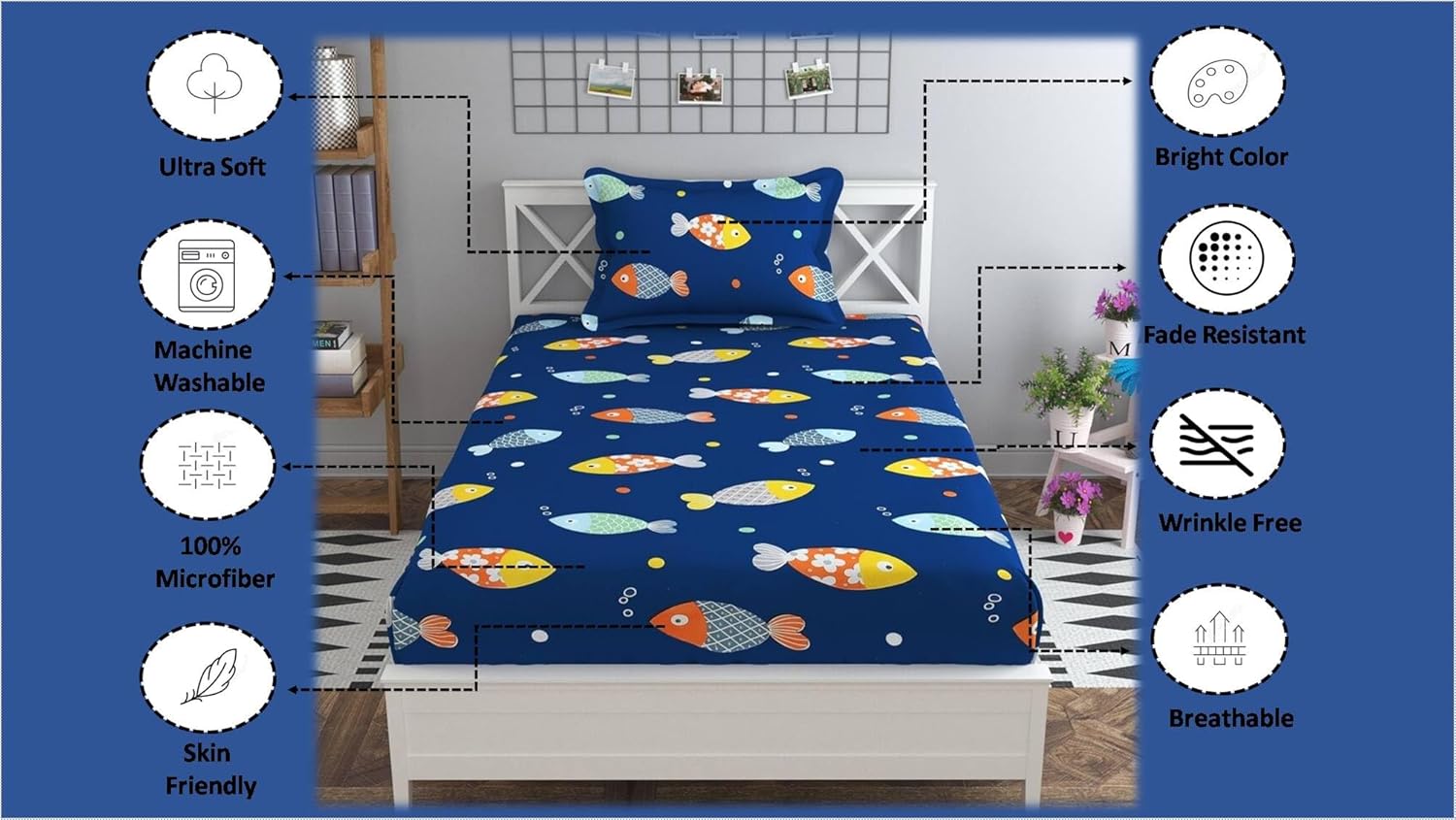 These gorgeous cute blue fish bedsheet set match both room color and your customized home styles, fit well for / Kids Room/ Nursery Room/ Hostel Room/ Baby Room