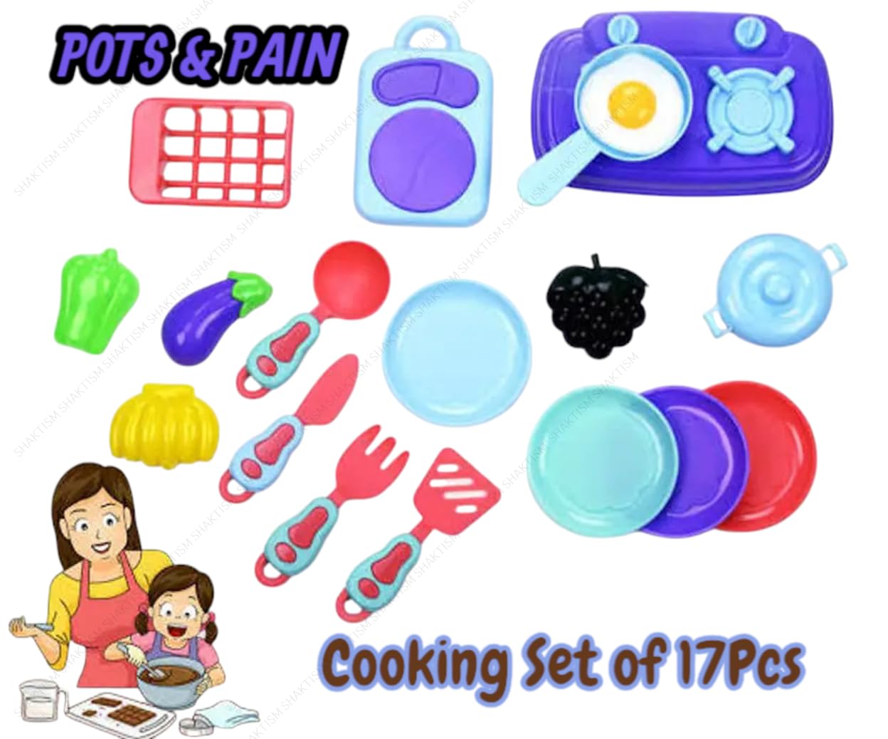 COMPLETE SET: 17-piece kitchen play set includes stove, faucet, dish rack, pans, pretend vegetables, fruits, and cooking utensils for a comprehensive cooking experience