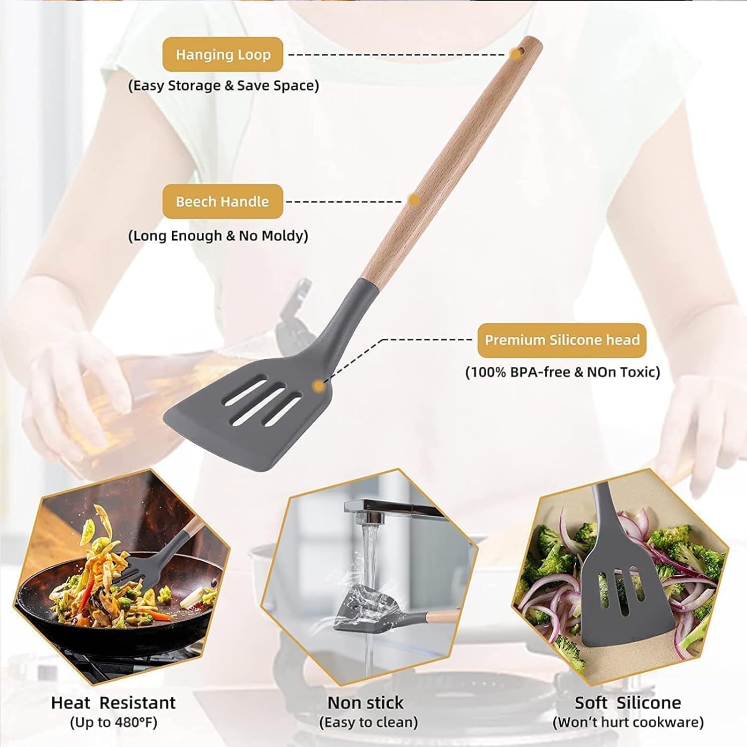 QUALITY ASSURED : black silicone with natural wood handle, sturdy and durable, silicone and wooden part would not get separate as the handles are well sealed, no worry about water and food getting between silicone and handle