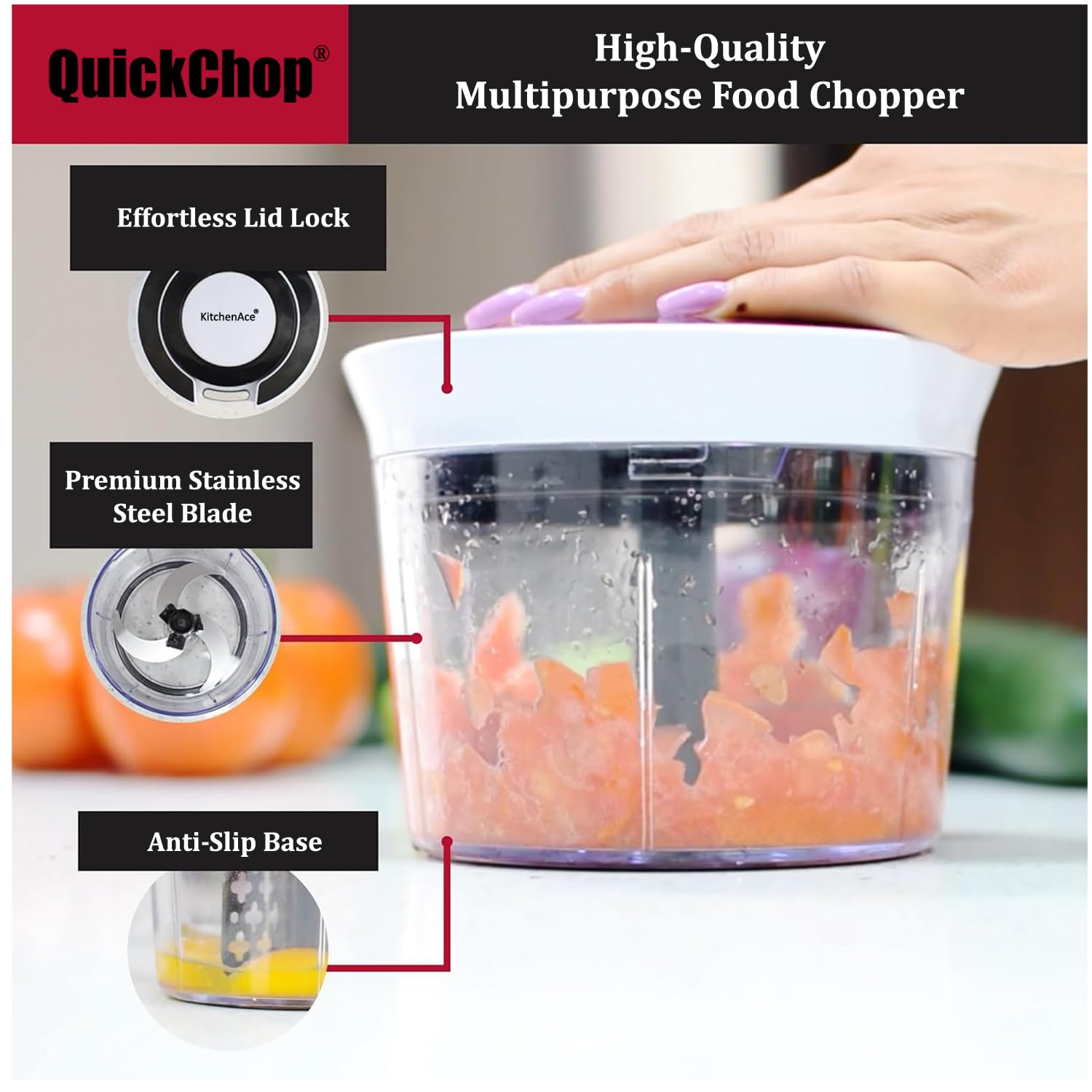 No knife skills? No problem! Our manual chopper makes cutting fruits and vegetables effortless. Just press the blade handle and move it back and forth for fast chopping. Designed with a non-slip base and durable stainless steel, it ensures long-lasting use. Plus, it’s dishwasher safe (except the lid)