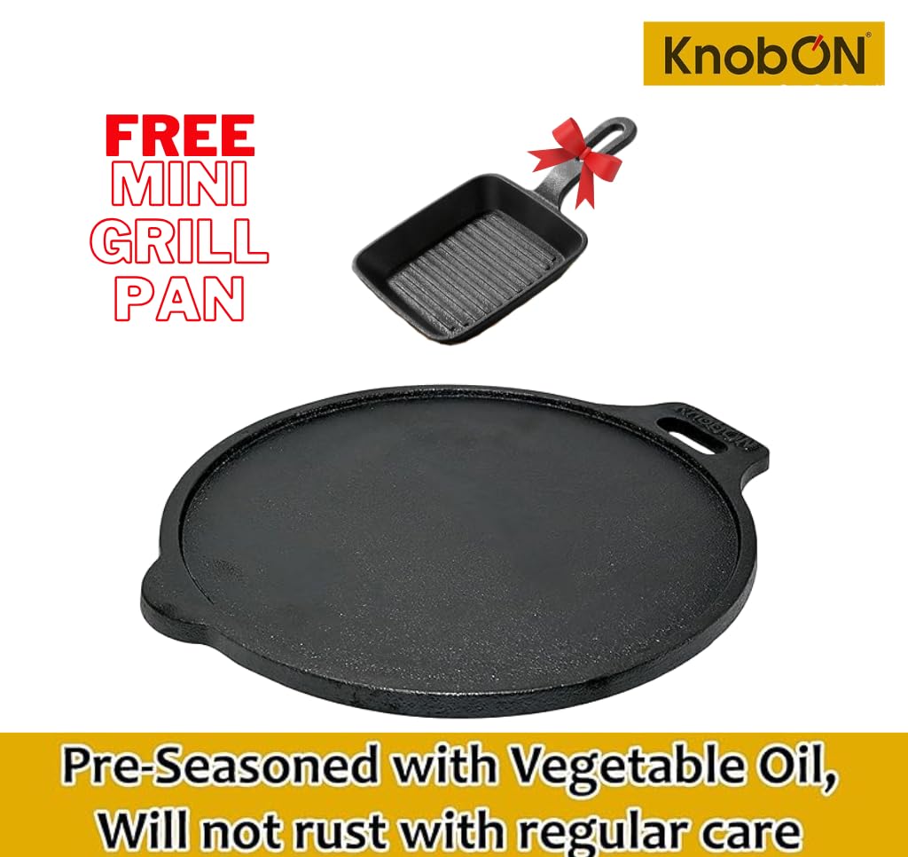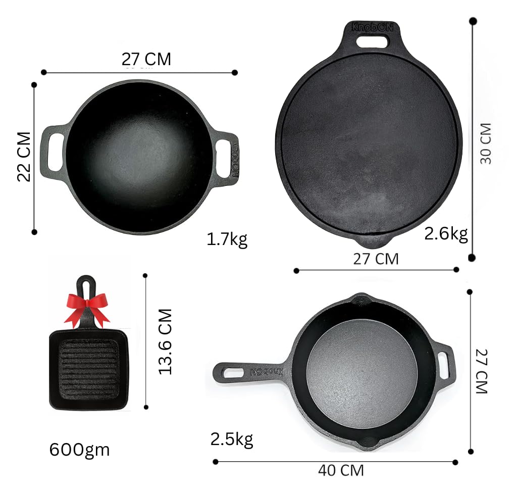 KnobON 7 Layer Pre-Seasoned Cast Iron Cookware Set + Free Mini Grill Pan| Tawa (27 cm)+ Kadai (22cm 1.4L)+ FryPan (26 cm 1.5L) Kitchen Cooking Combo Pots & Pans Set of 4 Pcs, Black