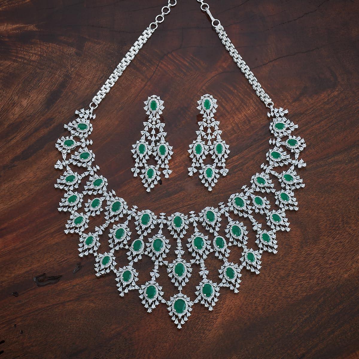 KUSHAL’S Fashion Jewellery Green Rodium Polished Zircon Necklace Set With Hanging Earrings & Adjustable Chain | Best For Gifting & Special Occasion | Jewellery Set For women – 434743