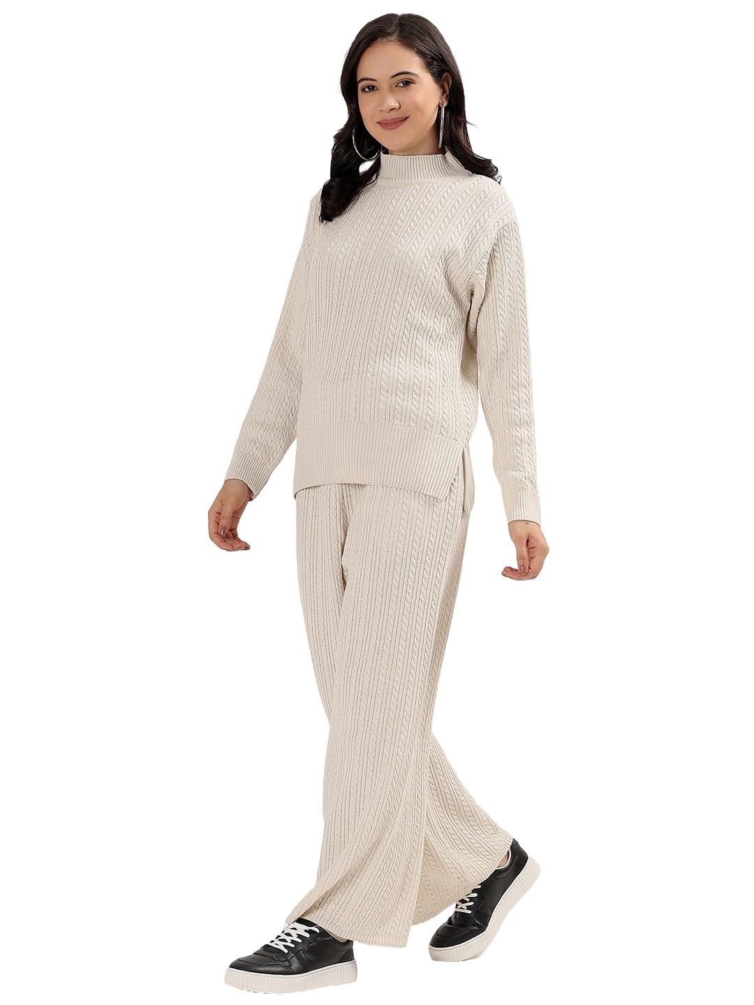 Stay cozy and stylish with Kvetoo’s winter coord set for women. Crafted from a soft wool blend, this matching high-neck sweater and wide-leg pant set is ideal for daily wear, lounging, office, or travel. The ribbed knit fabric ensures a flattering fit with lasting comfort. A must-have knitted two-piece set for winter fashion lovers, it’s both elegant and functional, suitable for home wear and outings alike.