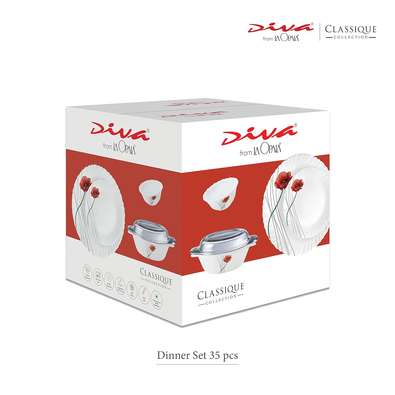 Package Contents: 6N Full Plate (270 mm), 6N Quarter Plate (190 mm), 6N Veg Bowl (200 ml), 6N Soup Bowl (300 ml), 6N Spoon, 1N Oval Platter (330 mm), 2N Casserole (1350 ml) and 2N Casserole Lid (Clear)