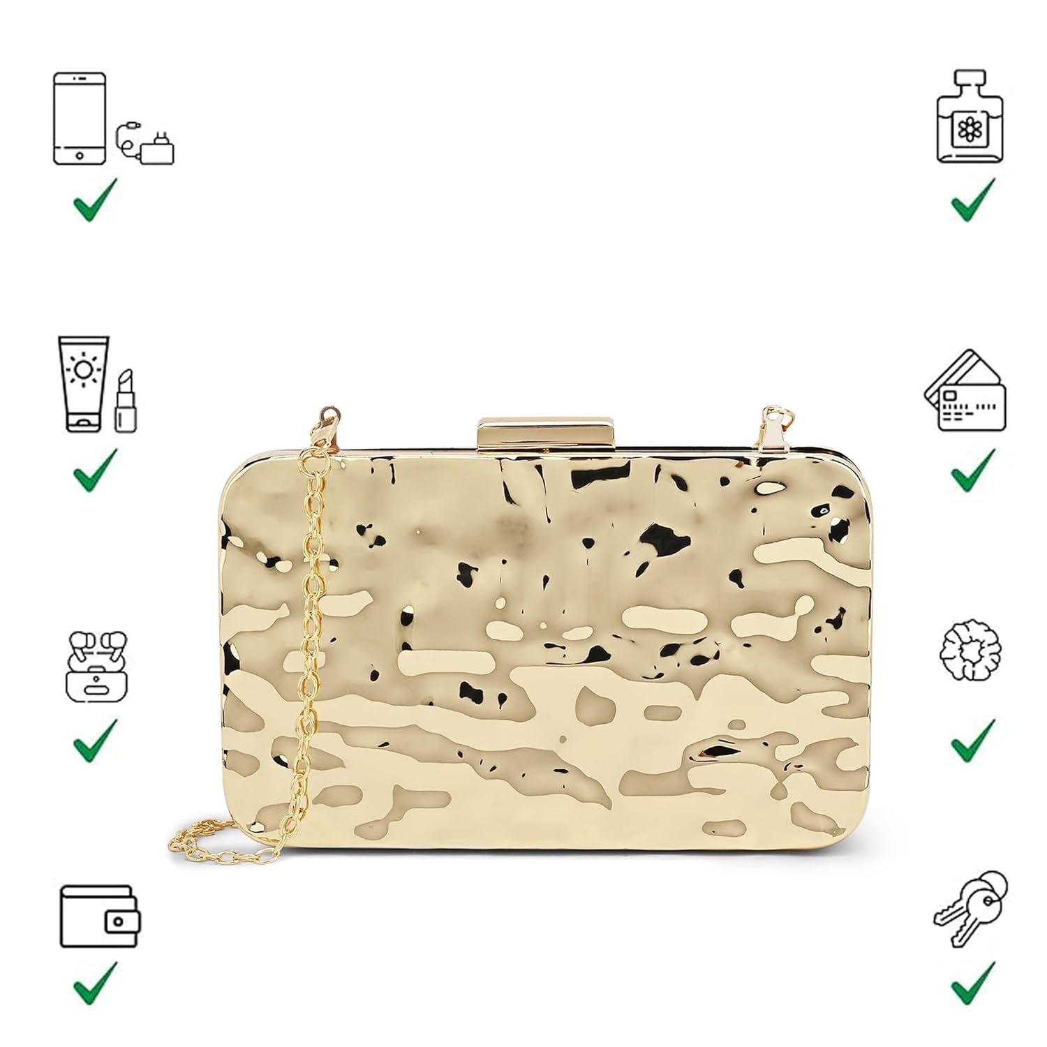 This elegant metal sheet clutch features stunning texture and a detachable chain, making it the perfect accessory for any evening dress. Compact yet spacious, it securely holds essentials like your phone, lipstick, and mirror, adding a touch of shine to your look.