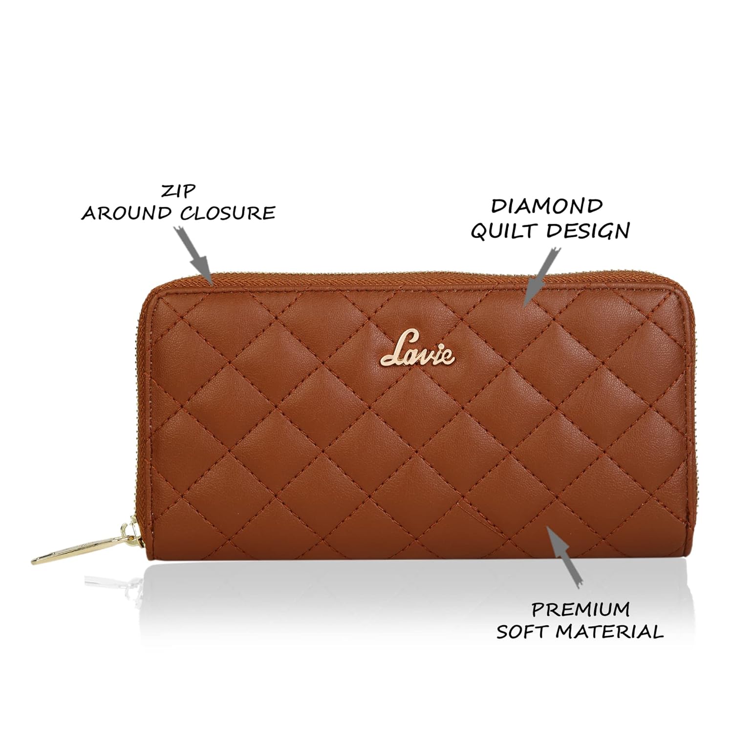 Quilt Eden is a classic metallic zip-around wallet by Lavie made from soft PU material with diamond quilting. It has two bill and cash compartments, multiple card slots and an internal zip pocket