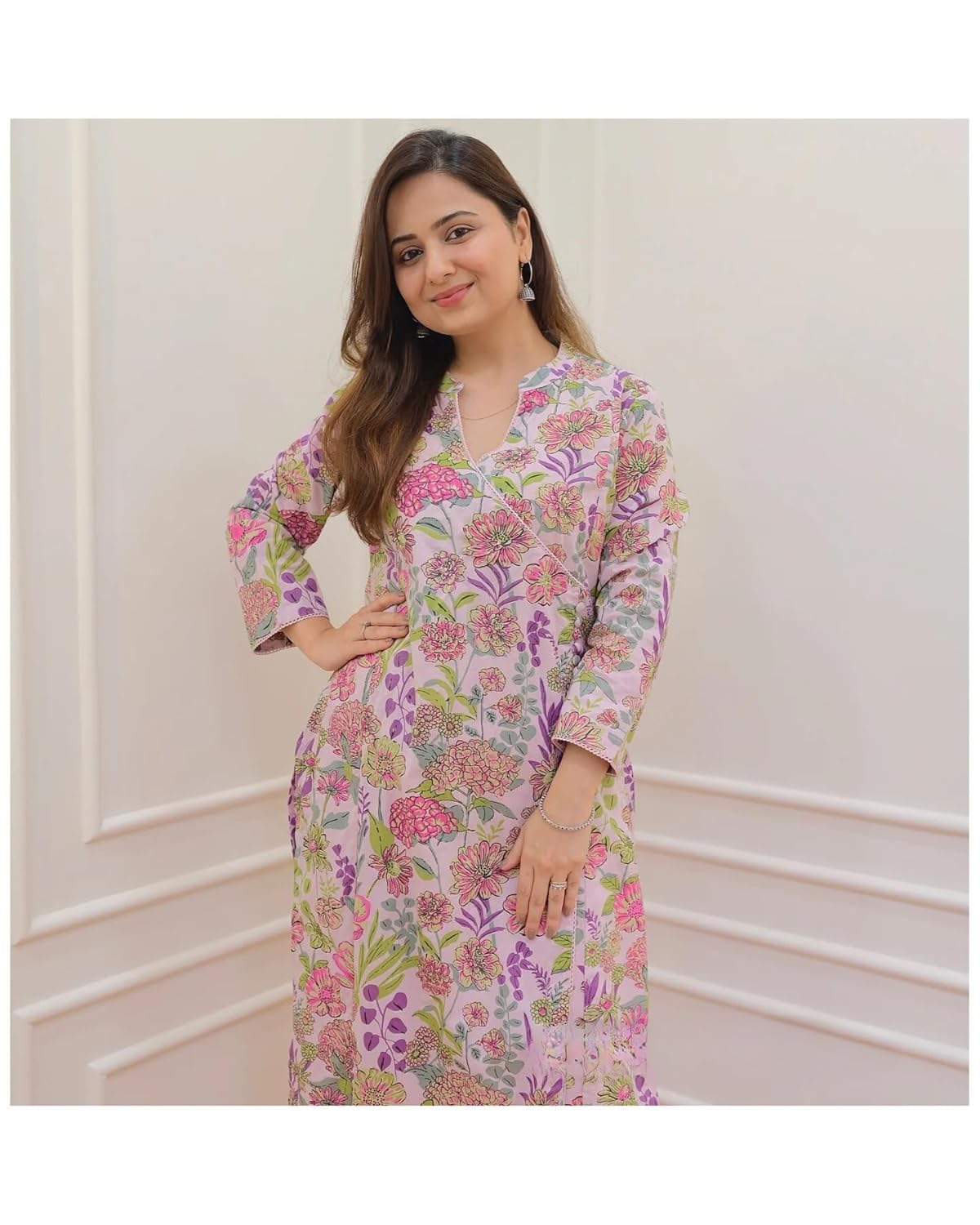 Stylish V-Neck Kurta with Chic Pink Leggings Floral print kurtaFloral print kurta