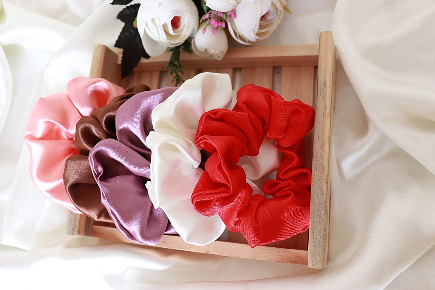 5 Pack scrunchies come with the package with solid color. They are handmade with love in our home studio. High quality satin material, handmade, soft to touch, will not hurt your hair.