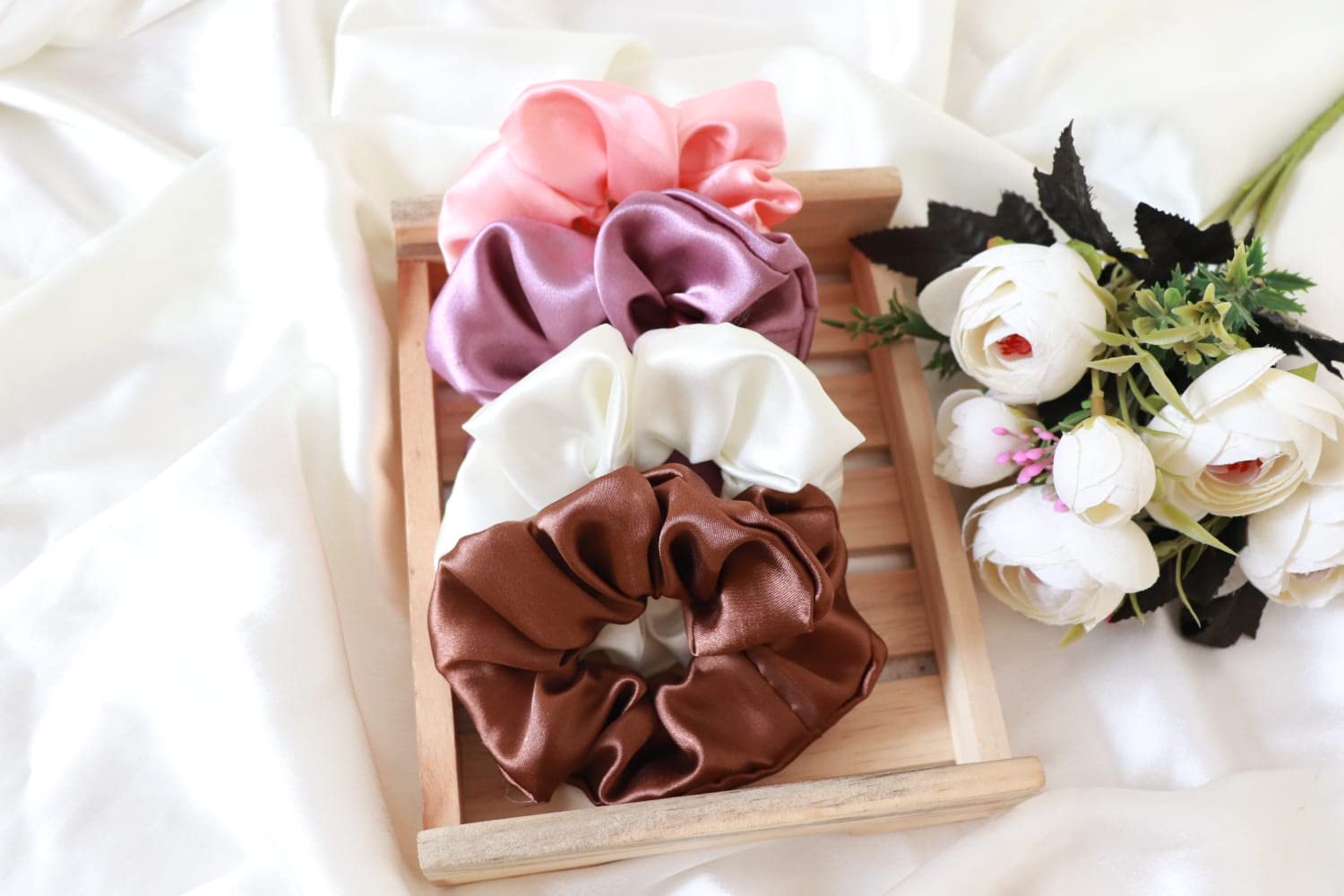 Our satin Scrunchies are made with high-quality super soft silk/satin with a firm elastic insert that is durable and comfortable to wear, even after several hours. Thanks to the softness of the material our scrunchies are ideal for both thick and thin hair types.