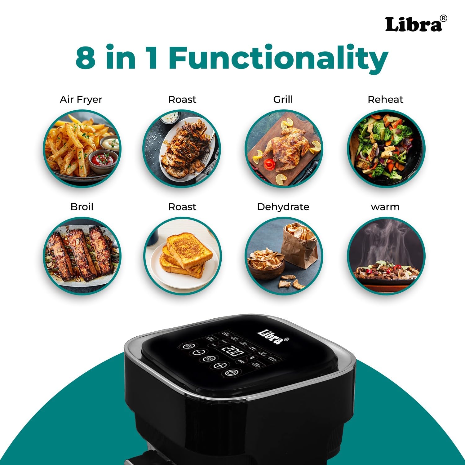 𝐎𝐧𝐞-𝐓𝐨𝐮𝐜𝐡 𝐂𝐨𝐨𝐤𝐢𝐧𝐠 𝐰𝐢𝐭𝐡 𝟖 𝐄𝐚𝐬𝐲 𝐏𝐫𝐞𝐬𝐞𝐭𝐬: Whether you’re new to air frying or a seasoned home chef, the Libra air-fryer makes cooking effortless. With 8 pre-programmed settings for fries, chicken, veggies, and more, you’ll get results at the touch of a button. The intuitive digital control panel lets you adjust temperature and time with ease.