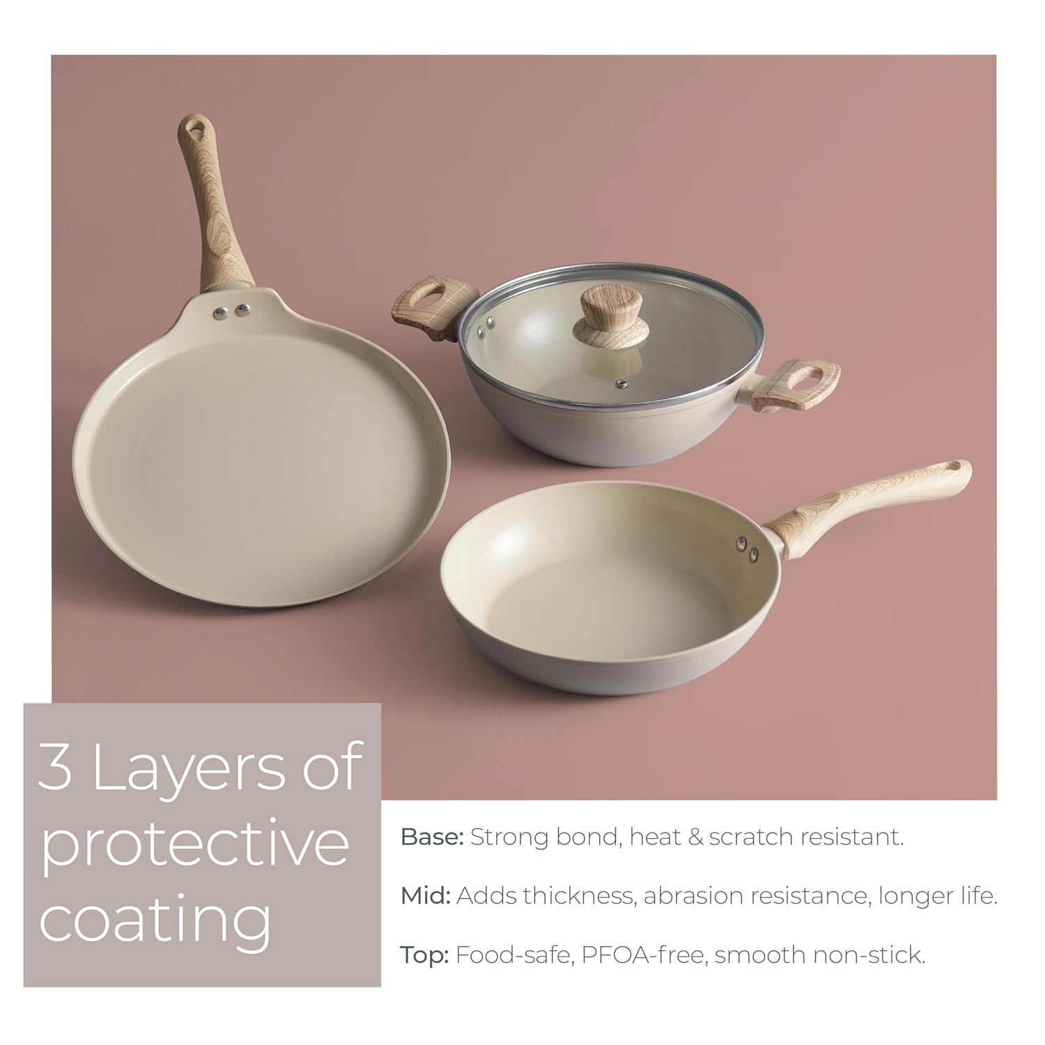 Versatile 3-piece cookware set – Includes a 2.2L kadhai with lid (24cm), 1.4L fry pan (24cm), and 1.2L tawa (26cm) to handle all your everyday cooking needs. Perfect for sautéing, frying, simmering, and more. An all-in-one solution for daily Indian and continental cooking.
