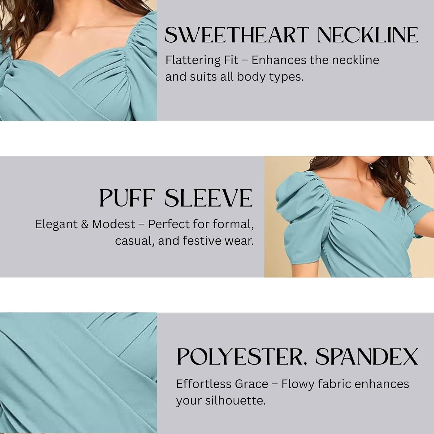 Sweetheart neckline for a chic lookStylish puffed sleevesWaist belt for a flattering silhouetteLightweight, ultra-soft polyspandex fabric