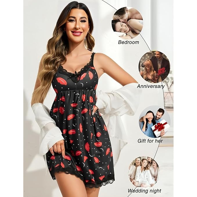Love Maker Women’s Babydoll Nightwear Lingerie Set Lips Print Design | Modal Blend Fabric | Stylish Cross-Back V-Neck | Includes G-String Panty |