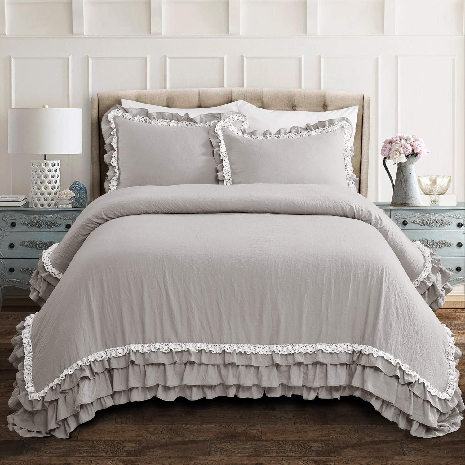 Lush Decor Ella Ruffle Lace Comforter, 3 Piece Set, King, Light Gray – Cute Comforter – King Bedding Set – Gray Bedding – Coquette Decor – Ruffle Trim – Lace Trim