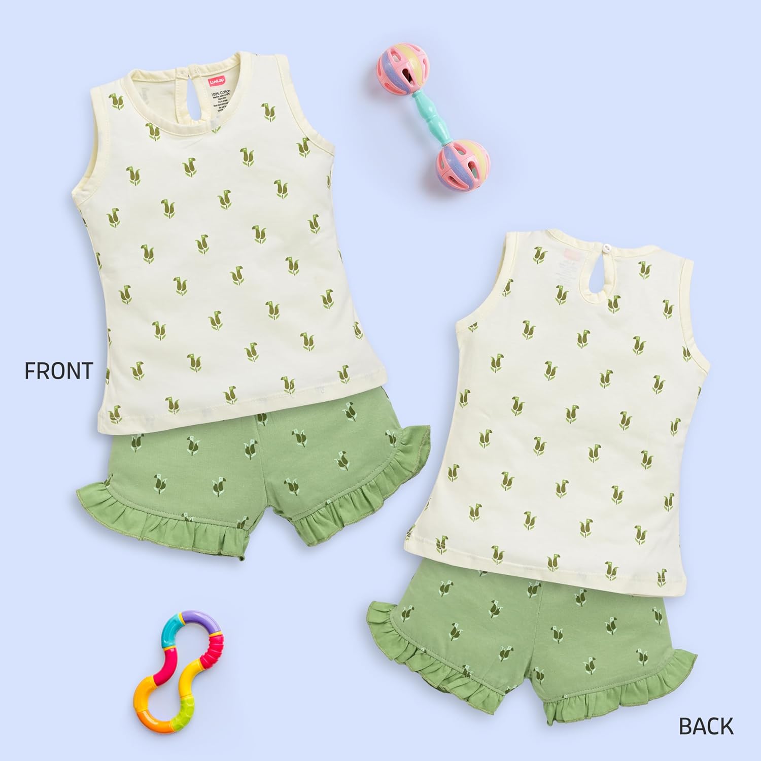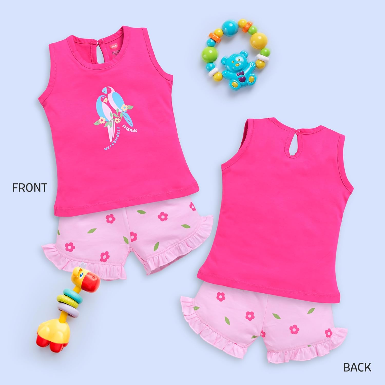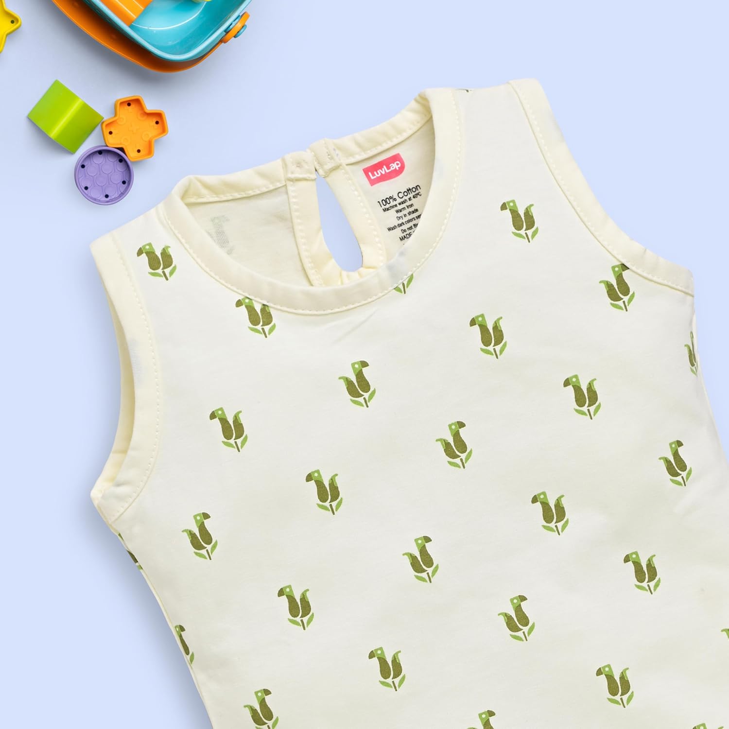 Made of 100% Cotton Knitted fabric makes it comfortable for the baby to wear. The attractive prints make the baby look more cuter. One pack consists of 3 sets of Sleeveless Top and Shorts Set.