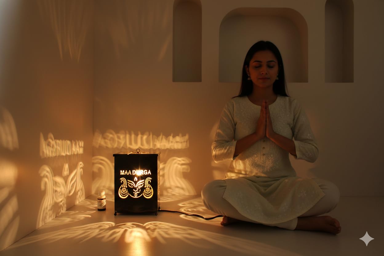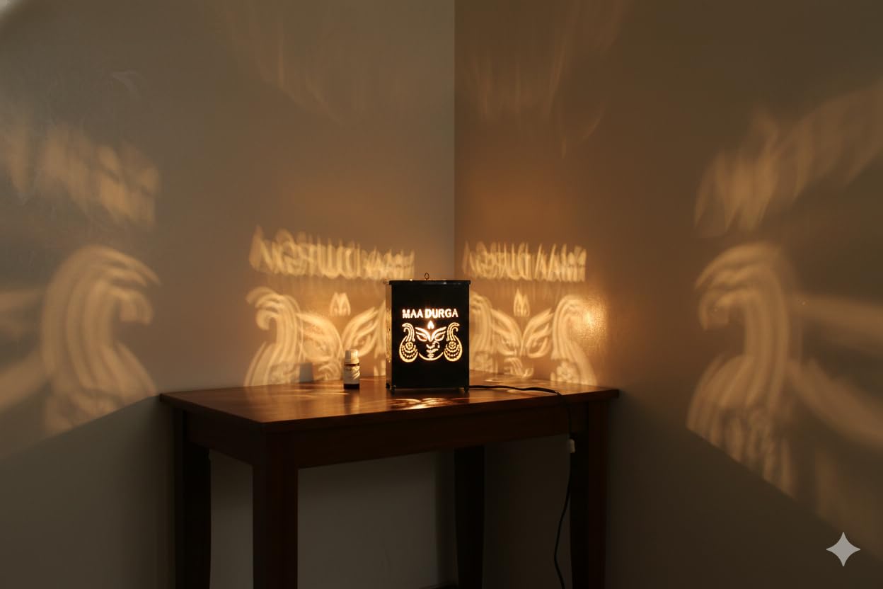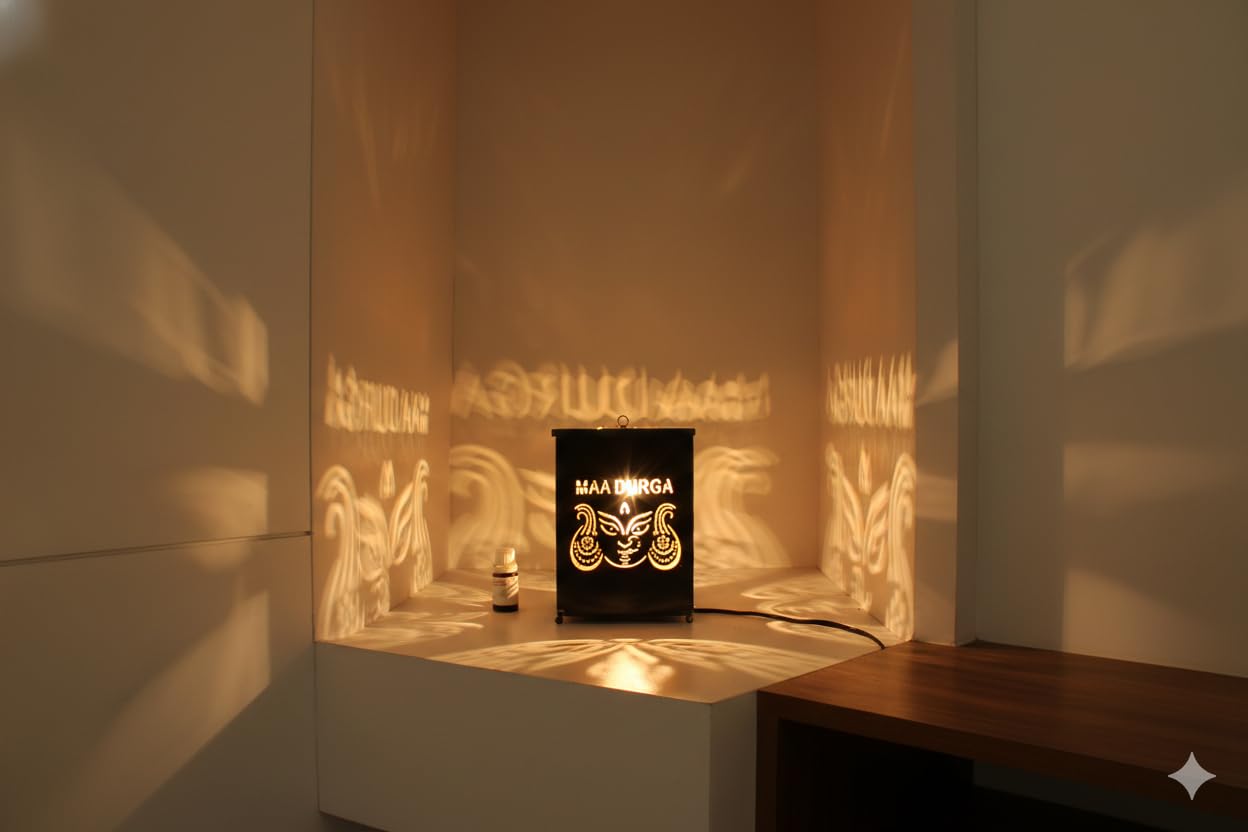SPIRITUAL LASER CUT DESIGN – BEAUTIFULLY CRAFTED METAL LAMP WITH MAA DURGA LASER CUT PATTERN THAT CREATES A SOOTHING SHADOW EFFECT AND ENHANCES THE DIVINE AMBIENCE OF YOUR HOME OR PUJA SPACE.