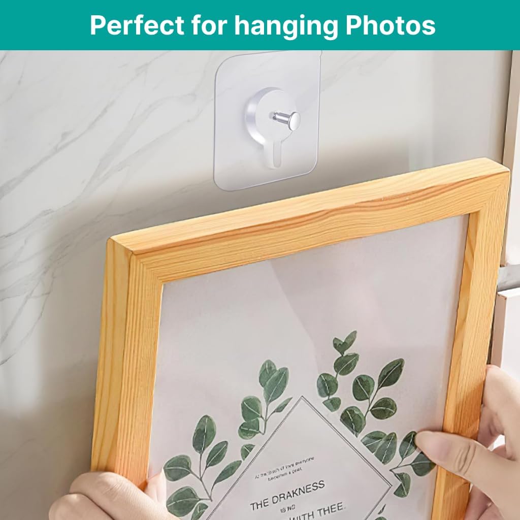MagicMonk Photo Frame Hooks for Wall Without Drilling, 10 Pack Self Adhesive Hooks for Wall Heavy Duty Strong Nail Free for Hanging Photo Frame (Hanging Hook, Transparent) Stainless Steel