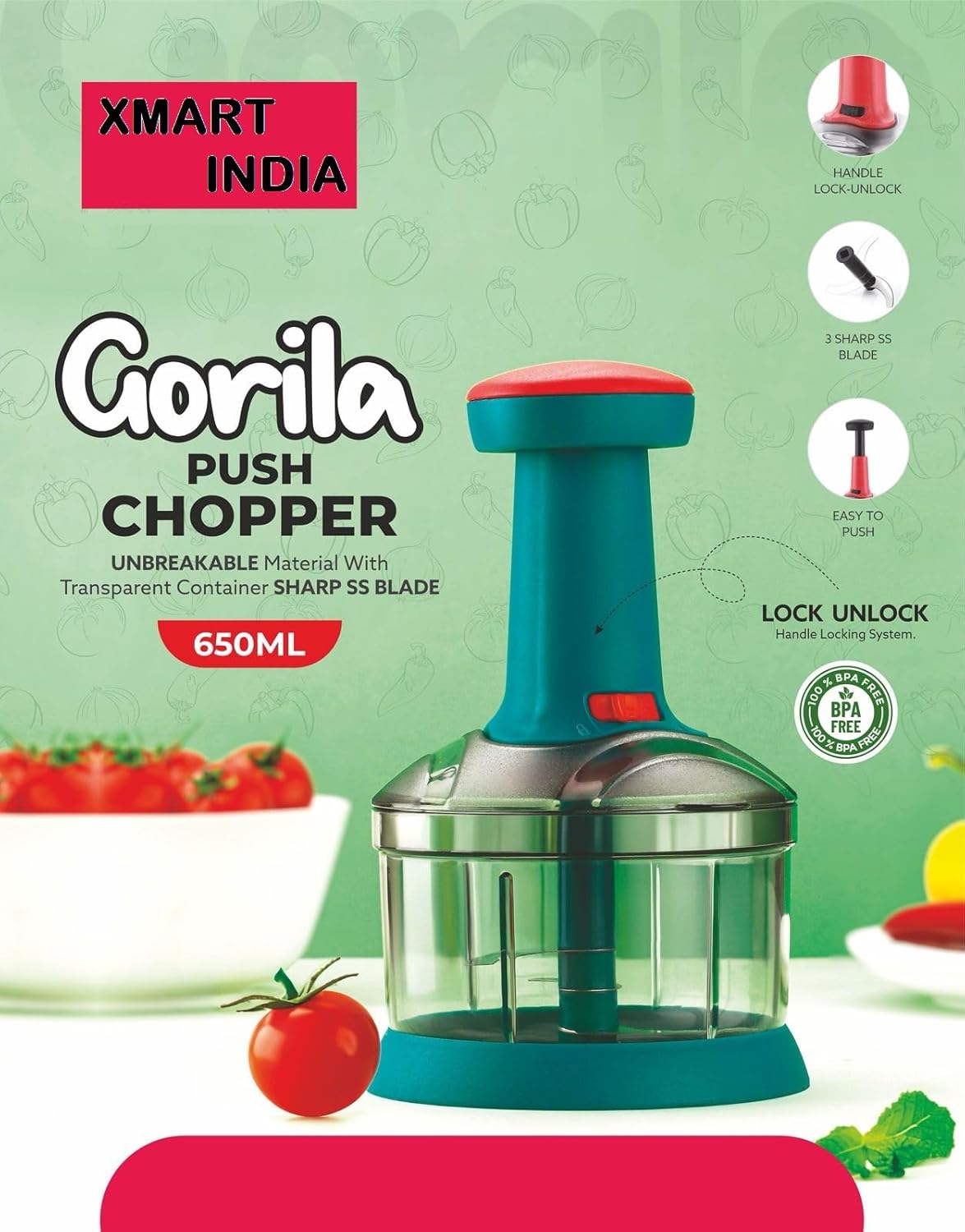 Simplify your kitchen prep with the Xmart India Manual Push Chopper – a powerful and compact tool designed for effortless chopping. Featuring 3 ultra-sharp stainless steel blades, this handy kitchen gadget quickly chops vegetables, fruits, herbs, nuts, and more with just a few easy pushes. Its unique push-down mechanism uses your body weight for efficient chopping, making it faster and easier than traditional methods. Crafted from BPA-free, food-grade plastic, the chopper is safe for everyday use and easy to clean. The non-slip base ensures stability during operation, while the compact design allows for convenient storage in any kitchen. A built-in locking system secures the blades and handle for added safety and space-saving. Whether you’re preparing a salad, curry base, or chutney, the Xmart India Push Chopper saves time and effort—making it an essential tool in every modern kitchen. Quick, clean, and efficient—just push and chop!