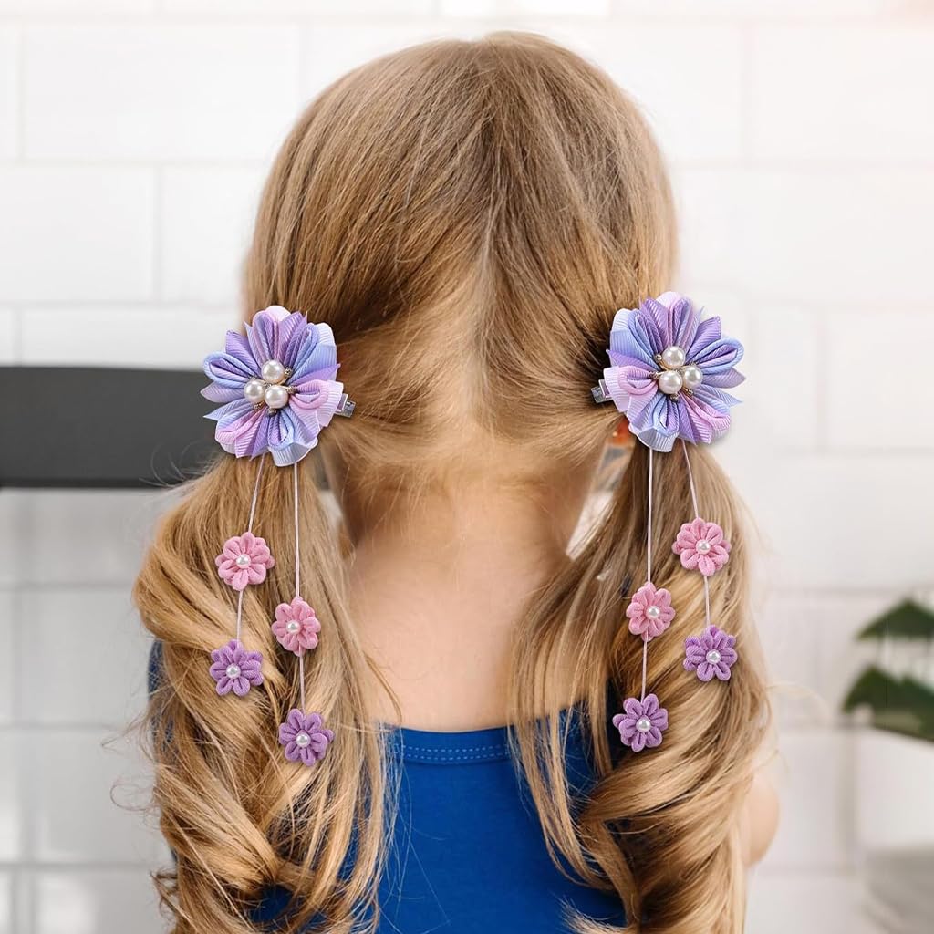 ELEGANT DESIGN: This set includes 4 charming hair bows in two colors, designed with intricate details like small flowers and beads connected by delicate threads. These hair accessories are thoughtfully crafted to add a touch of playfulness and sophistication to any look, making them perfect for pigtails, braids, or simply clipping hair to the side for an adorable effect.