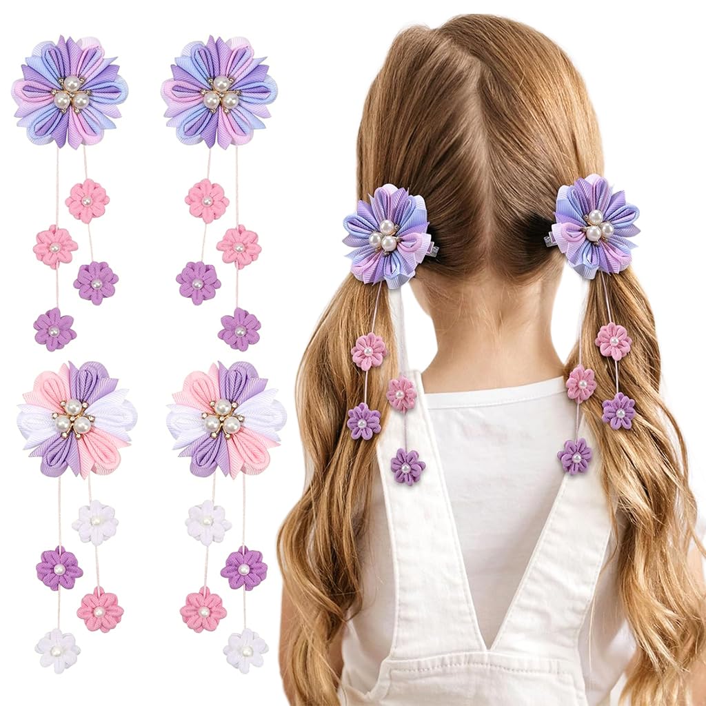 This set includes four beautifully crafted bows in two soft colors, detailed with delicate flowers and beads. Ideal for pigtails, braids, or side clips, they add a playful yet refined charm to any hairstyle.
