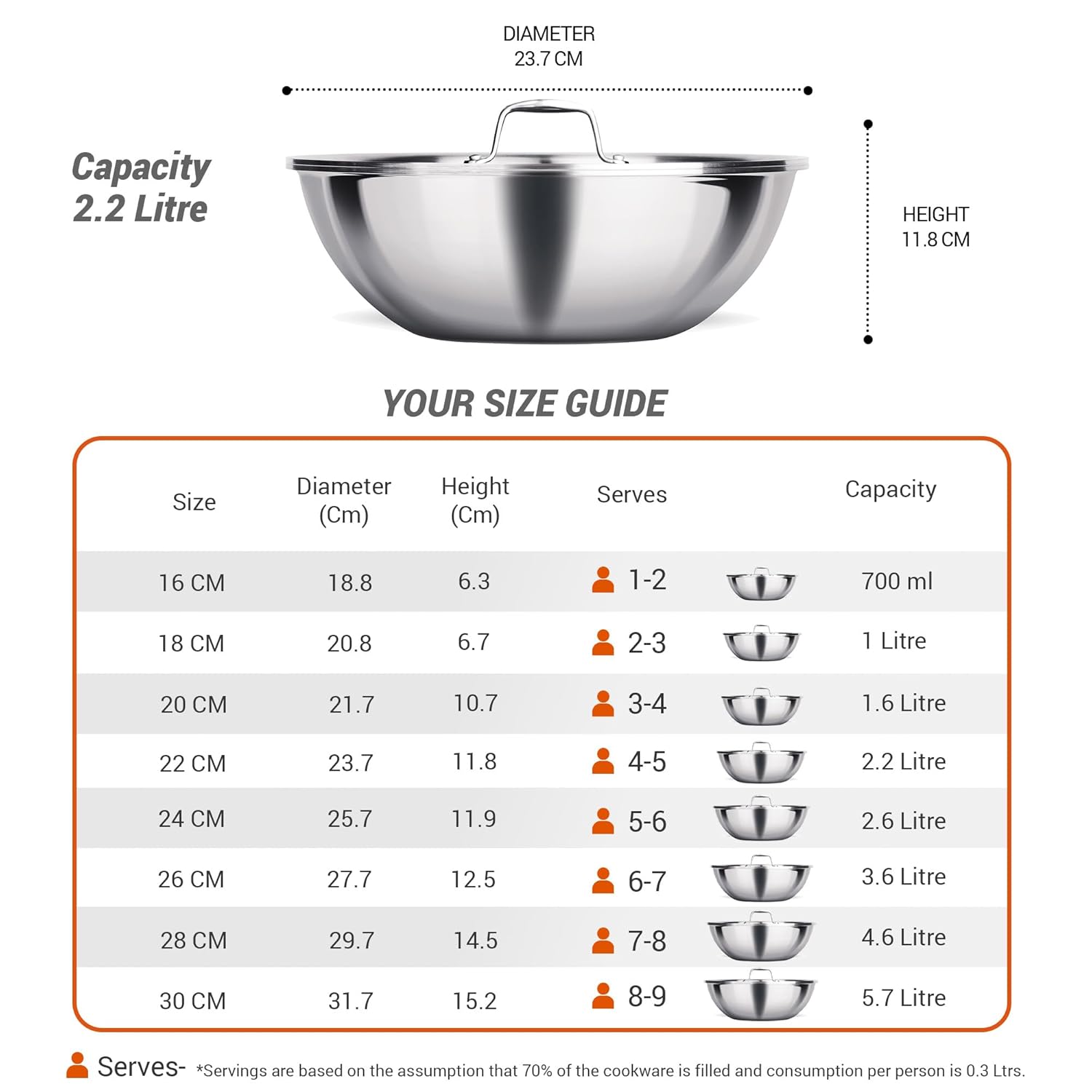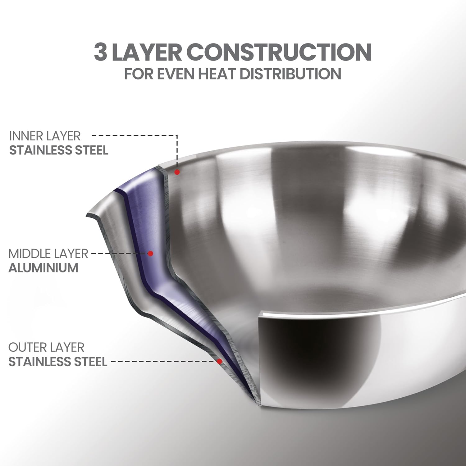 Tri-Ply Excellence: The tri-ply construction features three layers, food-grade 18/8 stainless steel for safe cooking, a middle layer of encapsulated aluminum for even heat distribution and faster cooking, and SS 430 magnetic stainless steel on the outside for induction compatibility, ensuring uniform cooking, no hot spots, and consistently delicious results.