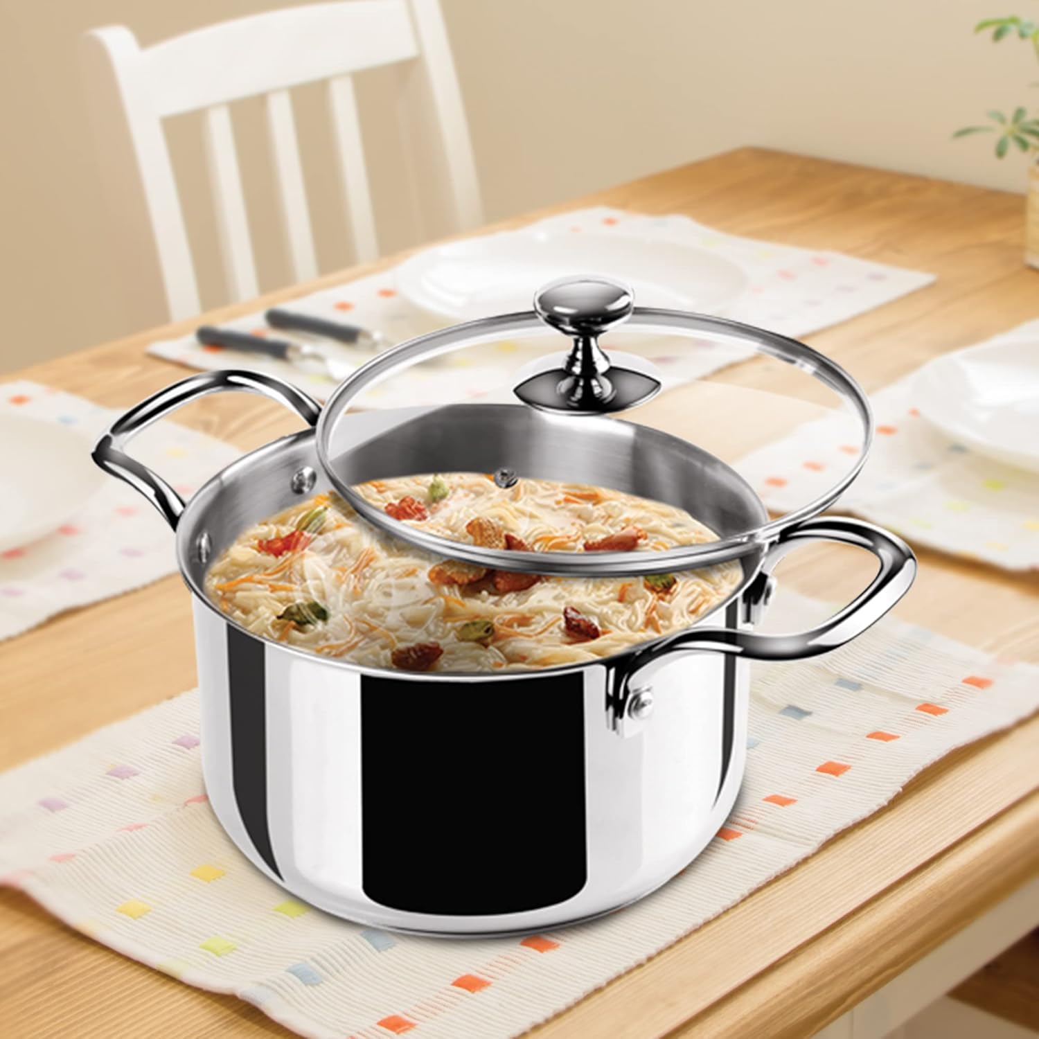 Specially designed rolled edge at top for drip less pouring. Toughened glass lid with air event allows you to see the beverage while cooking, air vent allows excess steam to release while cooking. It is Dishwasher safe for ease of cleaning and maintaining.