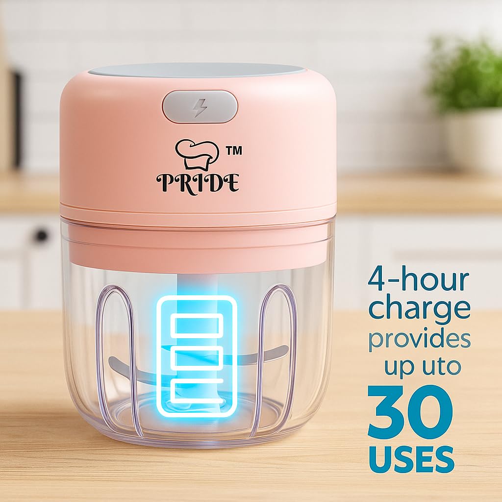 Rechargeable PRIDE Chopper with high-torque motor chops veggies effortlessly. Compact, energy efficient, and easy to use—every time.