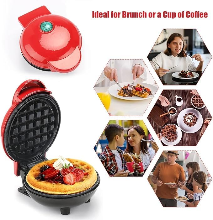 Mini Waffle Maker, Non-Stick Round Electric Waffle Iron, Red and Black