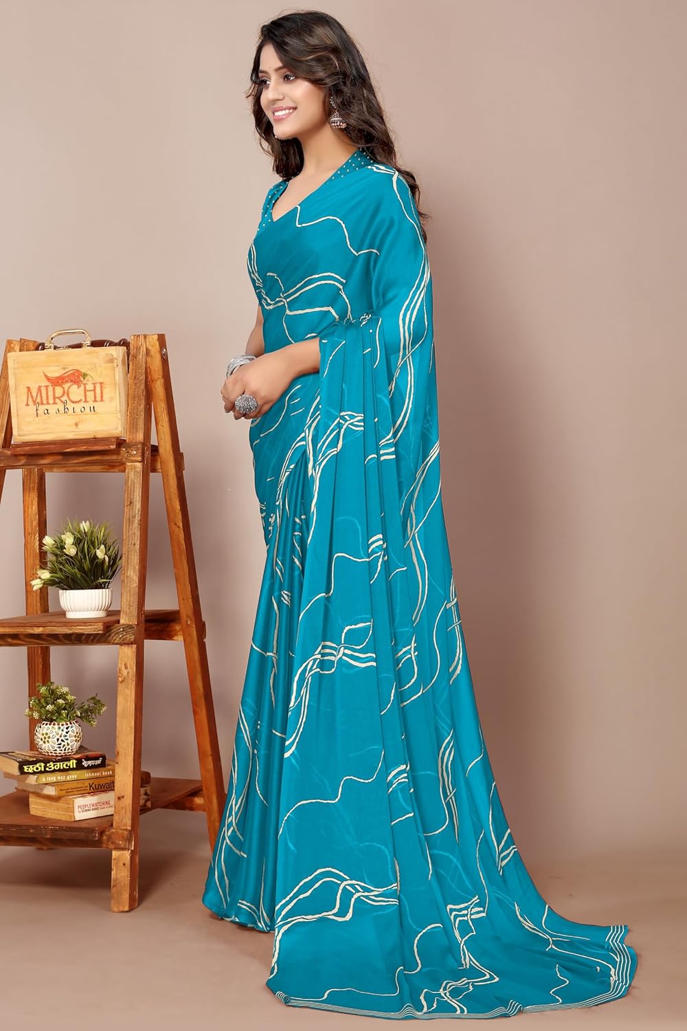 The geometric print on the saree adds a modern touch to traditional attire, making it a fashionable choice for those looking to blend contemporary and ethnic styles.