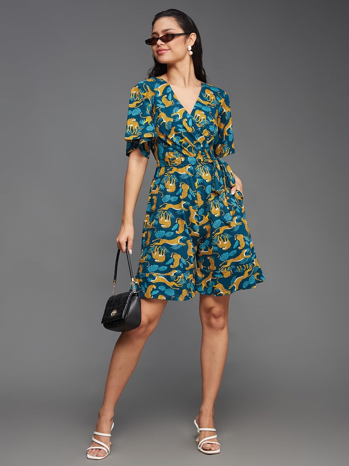Miss Chase Women’s V Neck Half Sleeve Conversational Printed Wrap Knee Long Playsuit