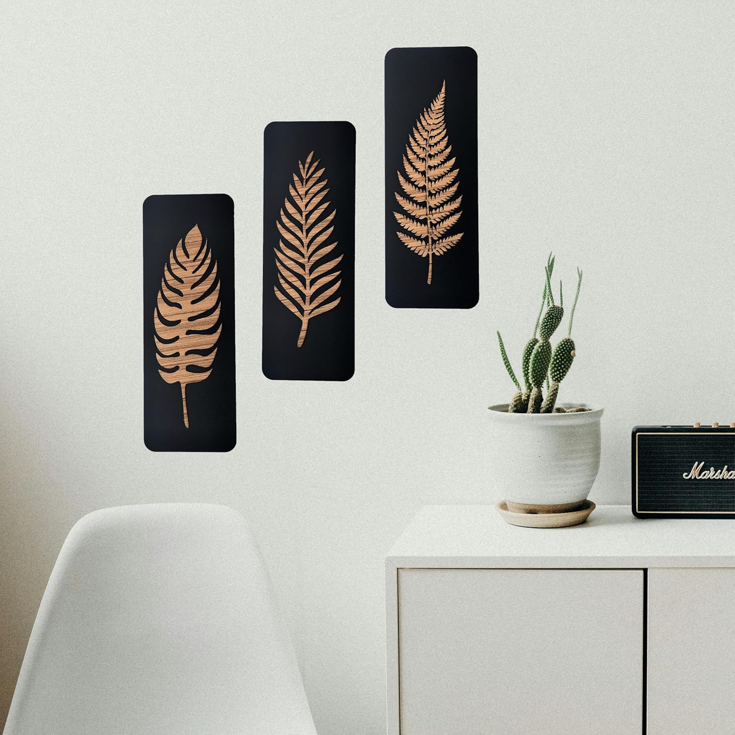 MODERN BOIS ART 3 Pieces Boho Wall Hanging Art Home Decor items, Decoration for living Room Bedroom, Wood wall art Leaf Art Pack of 3 Pieces (Boho01) (Black & Wood)