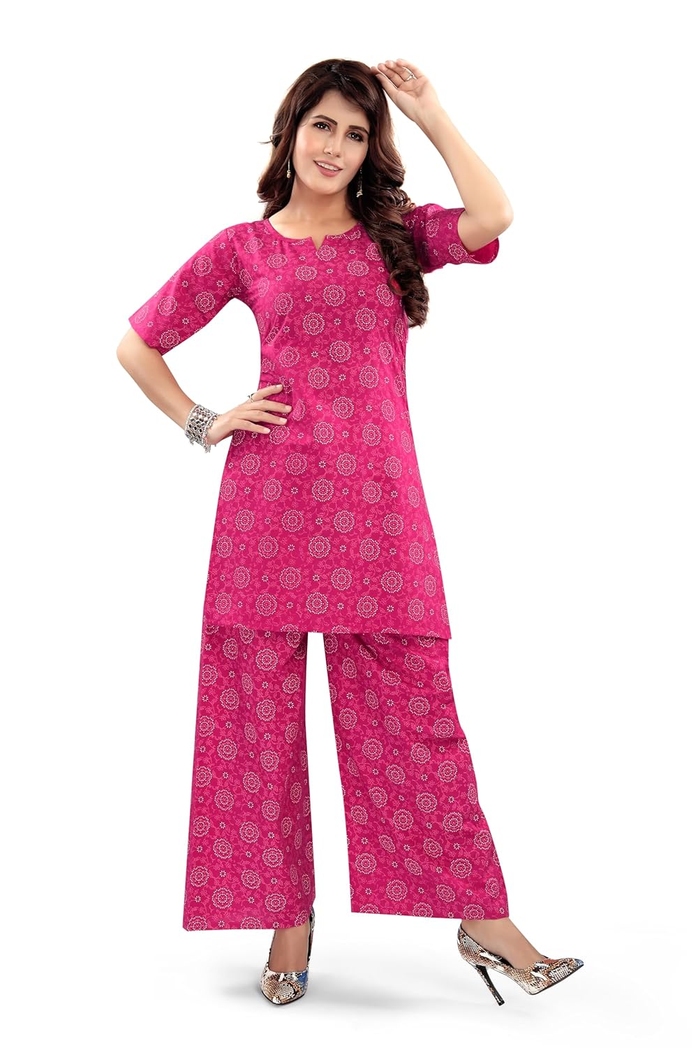 Pure Fabric : Our Night suit is made of 100% cotton, which is super soft, breathable, skin friendly and keep you comfortable throughout day & night.Versatile Style : Our Co-ords set can be worn as a nightwear for good night sleep. It is perfect for casual wear, style it as a loungewear and it is suitable for outing and comfortable for travelling.Design details : This co-ord set has floral print overall, The top has round neck, small sleeves, hip length with side slits. The bottom has flare look and adjustable high quality elastic waist band.