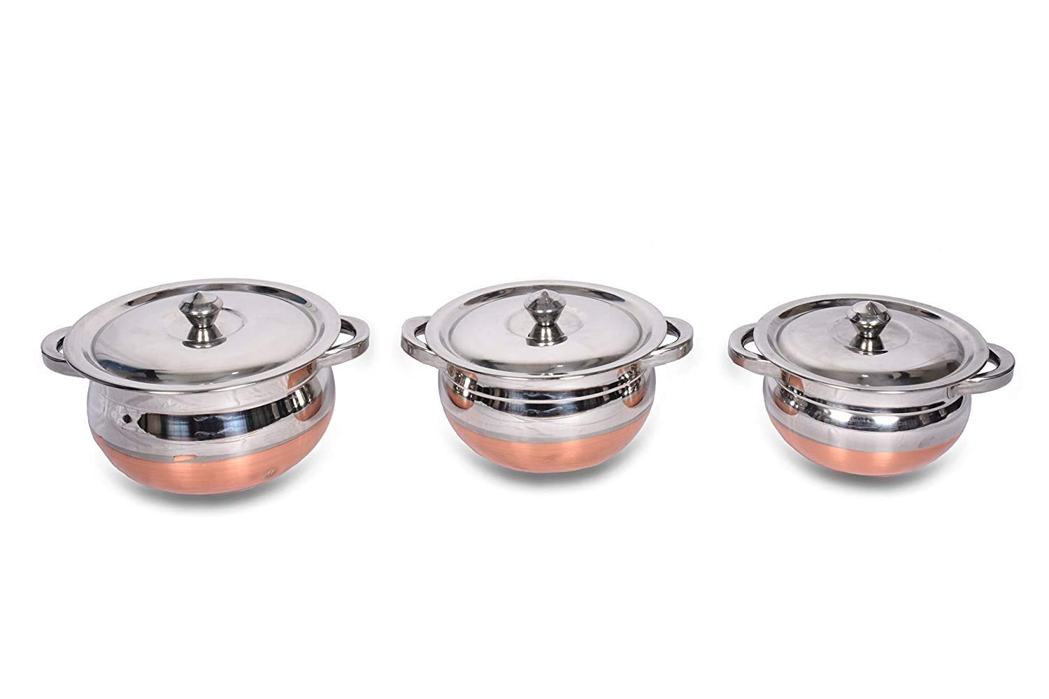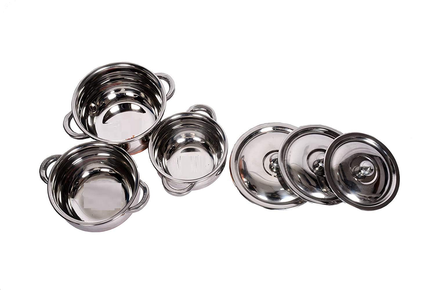 MOOVER Kitchen Stainless Steel Handi Set With Lid Set Stainless Steel Handi Set for Cooking, Serving, Baking, Prepping Use (Set of 3) The stylish Stainless Steel Handi Set of 3 pc will be excellent addition to your kitchen and will look great when placed on the kitchen rack. The Stainless Metal makes these great for regular use and will serve you for years together. When you serve the delicious dishes in these Handis, heads will turn and appreciations will flow. Enhance your kitchen decor and ensure a healthy way of life by bringing home Utensils. Matching up with the ever-increasing requirements of the customers, brings to you Handi cookware sets with Simple Laser Powder Coating colours simple colours handcrafted hammered texture effect. This effect is specially done by skilled craftsman of India with care and their experience. Made of premium, food-grade quality stainless steel, the Handi set prevents food contamination. It allows the use of this set on an induction top as well as a gas stove. Compaq size makes it easy to store in kitchen cupboards. When not in used smaller container can be stacked inside bigger container saving lot of storage space. A mirror finish lends this set a rich look that will surely make your dining experience with family and friends memorable. -:Dimensions:- Handi 1 :- 14 X 14 X 6 cm Handi 2 :- 16 X 16 X 7 cm Handi 3 :- 18 X 18 X 7 cm -:Capacity:- 1.400 LTR 1.700 LTR 2.100 LTR