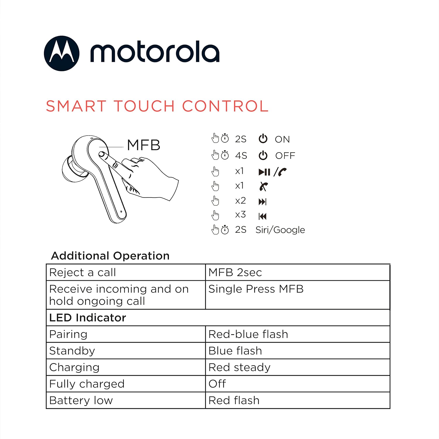 TRUE WIRELESS EARBUDS: Motorola wireless earbuds are designed with comfort in mind and portability to use anywhere for multitasking. These affordable water resistant ear buds with totally 15 hours of playtime offer superior sound and handsfree calling. HANDS-FREE CALLING: Wireless earbuds for phone calls feature a built-in microphone in each ear bud for use together as pair, or as mono headset. Smart touch-control for calls, volume, skip and voice command are ideal travel accessories for work or school. IPX5 WATER-RESISTANT: Designed for everyday use, these Bluetooth earphones help resist sweat, moisture, and the elements to ensure a crystal clear sound experience for travel. These ear buds make a great gift for everyone. CONVENIENT DESIGN: These Bluetooth ear buds are ergonomically designed for the most comfortable earbuds. Our wireless ear buds come in three different sizes for an optimal fit and audio experience. It comes with a sleek, compact, and fast charging case. ABOUT US: Life is better with great sound. That’s why Motorola Sound designs products for the way you really hear. We carry true in-ear headphones, true wireless earbuds, over-ear headbands, and more