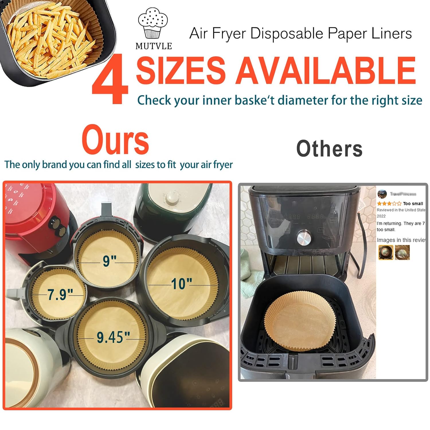 【Info】 XX-Large Size. 100 Pcs. Round Shape. Wide 10 inches (overall can max extend up to 12.2 inches), bottom wide 9.06 inches, high 1.8 inches, perfects for 7 quart or bigger air fryer use. PLEASE MEASURE YOUR AIR FRYER BASKET BOTTOM BEFORE PURCHASE!