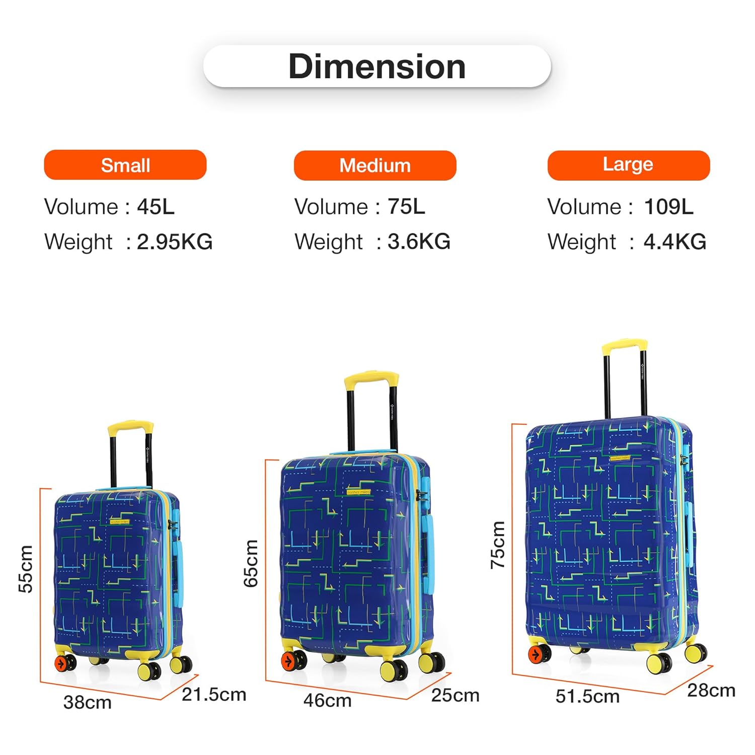 Lightweight: Hard side 2-piece luggage set which includes the following sizes: Small: 55 cms and Medium: 65 cms .The 55 cm bag can be used as a cabin luggage, and 65 cm can be used as a check-in luggage.