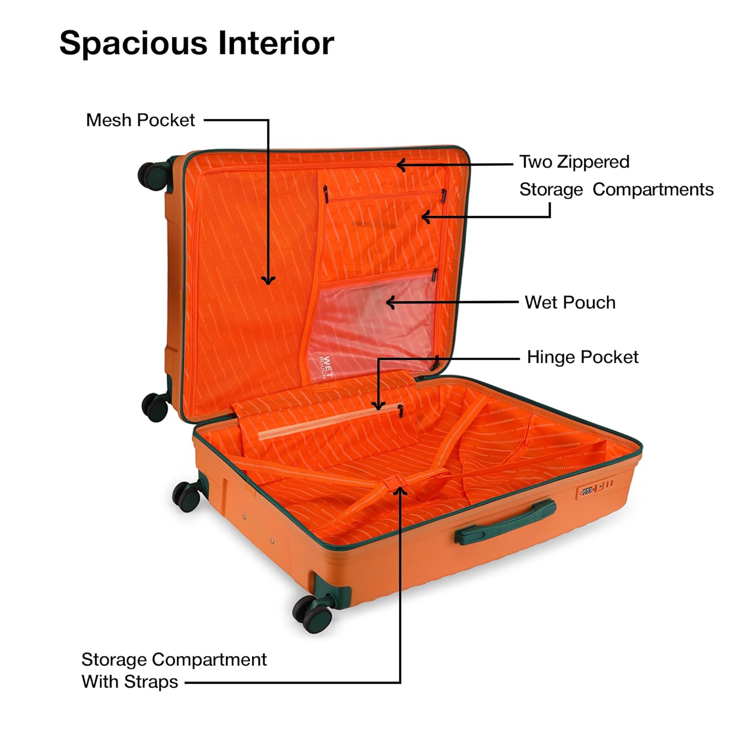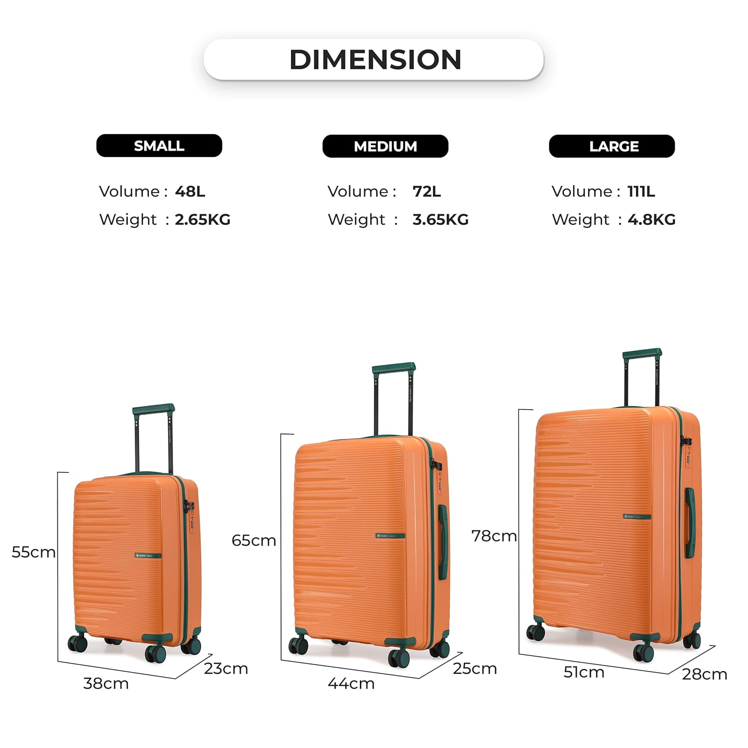 Ergonomic Telescopic Handle Designed for smooth maneuverability, this handle adjusts to your ideal height, allowing you to glide effortlessly through crowded terminals, platforms, or busy streets. Secure Travel Lock This TSA lock provides unmatched protection for your luggage, ensuring that your belongings remain safe, ensuring smooth and efficient travel. Anti theft Zipper Keep your belongings safe with the built-in anti-theft zipper. Designed to prevent unauthorized access, this feature ensures your wallet, passport, and electronics stay secure. Easy to Carry This trolley bag features an ultra-lightweight yet exceptionally durable design, making it easy to carry. Crafted from premium polypropylene, it delivers a smooth and comfortable travel experience—without the added bulk. Smart Interior Organization Designed with multiple compartments, including mesh dividers, zippered pockets, elastic compression straps, this trolley bag ensures your clothes, gadgets, and accessories stay organized and secure. Specifications Cabin | 55 cm | Small : 38 x 23 x 55 cm; 2.65 kg (Capacity: 48 liters) ; Check-in | 65 cm | Medium : 44 x 25 x 65 cm; 3.65 kg (Capacity: 72 liters) ; Check-in | 75 cm | Large : 51 x 28 x 78 cm; 4.8 kg (Capacity: 111 liters)