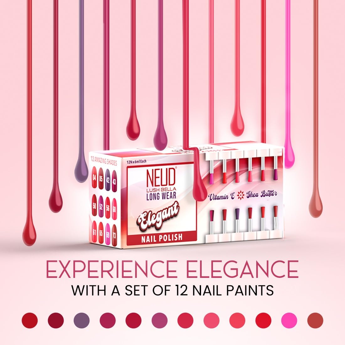 NEUD Lush Bella Nail Paint Combo Set, Elegant Long Wear Nail Polish Set, Gift set for Women,12 Amazing Shades, 6ml Each, Quick Dry & Highly Pigmented